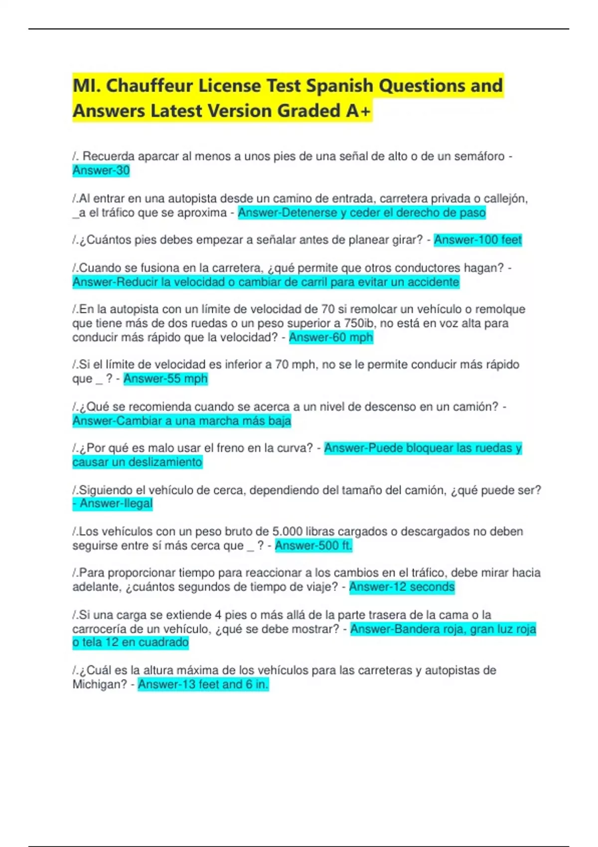 MI. Chauffeur License Test Spanish Questions and Answers Latest Version Graded A+ /. Recuerda aparcar al menos a unos pies de una señal de alto o de un semáforo - Answer-30 /.Al entrar en una autopista desde un camino de entrada, carretera privada o callejón, _a el tráfico que se aproxima - Answer-Detenerse y ceder el derecho de paso /.¿Cuántos pies debes empezar a señalar antes de planear girar? - Answer-100 feet /.Cuando se fusiona en la carretera, ¿qué permite que otros conductores hagan? - Answer-Reducir la velocidad o cambiar de carril para evitar un accidente /.En la autopista con un límite de velocidad de 70 si remolcar un vehículo o remolque que tiene más de dos ruedas o un peso superior a 750ib, no está en voz alta para conducir más rápido que la velocidad? - Answer-60 mph /.Si el límite de velocidad es inferior a 70 mph, no se le permite conducir más rápido que _ ? - Answer-55 mph /.¿Qué se recomienda cuando se acerca a un nivel de descenso en un camión? - Answer-Cambiar a una marcha más baja /.¿Por qué es malo usar el freno en la curva? - Answer-Puede bloquear las ruedas y causar un deslizamiento /.Siguiendo el vehículo de cerca, dependiendo del tamaño del camión, ¿qué puede ser? - Answer-Ilegal /.Los vehículos con un peso bruto de 5.000 libras cargados o descargados no deben seguirse entre sí más cerca que _ ? - Answer-500 ft. /.Para proporcionar tiempo para reaccionar a los cambios en el tráfico, debe mirar hacia adelante, ¿cuántos segundos de tiempo de viaje? - Answer-12 seconds /.Si una carga se extiende 4 pies o más allá de la parte trasera de la cama o la carrocería de un vehículo, ¿qué se debe mostrar? - Answer-Bandera roja, gran luz roja o tela 12 en cuadrado /.¿Cuál es la altura máxima de los vehículos para las carreteras y autopistas de Michigan? - Answer-13 feet and 6 in.