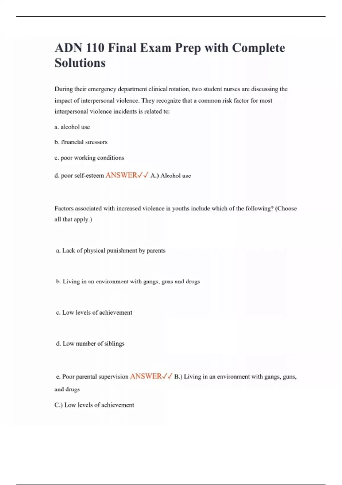 ADN 110 Final Exam Prep with Complete Solutions During their emergency department clinical rotation, two student nurses are discussing the impact of interpersonal violence. They recognize that a common risk factor for most interpersonal violence incidents is related to: a. alcohol use b. financial stressors c. poor working conditions d. poor self-esteem ANSWER A.) Alcohol use Factors associated with increased violence in youths include which of the following? (Choose all that apply.) a. Lack of physical punishment by parents b. Living in an environment with gangs, guns and drugs c. Low levels of achievement d. Low number of siblings e. Poor parental supervision ANSWER B.) Living in an environment with gangs, guns, and drugs C.) Low levels of achievement