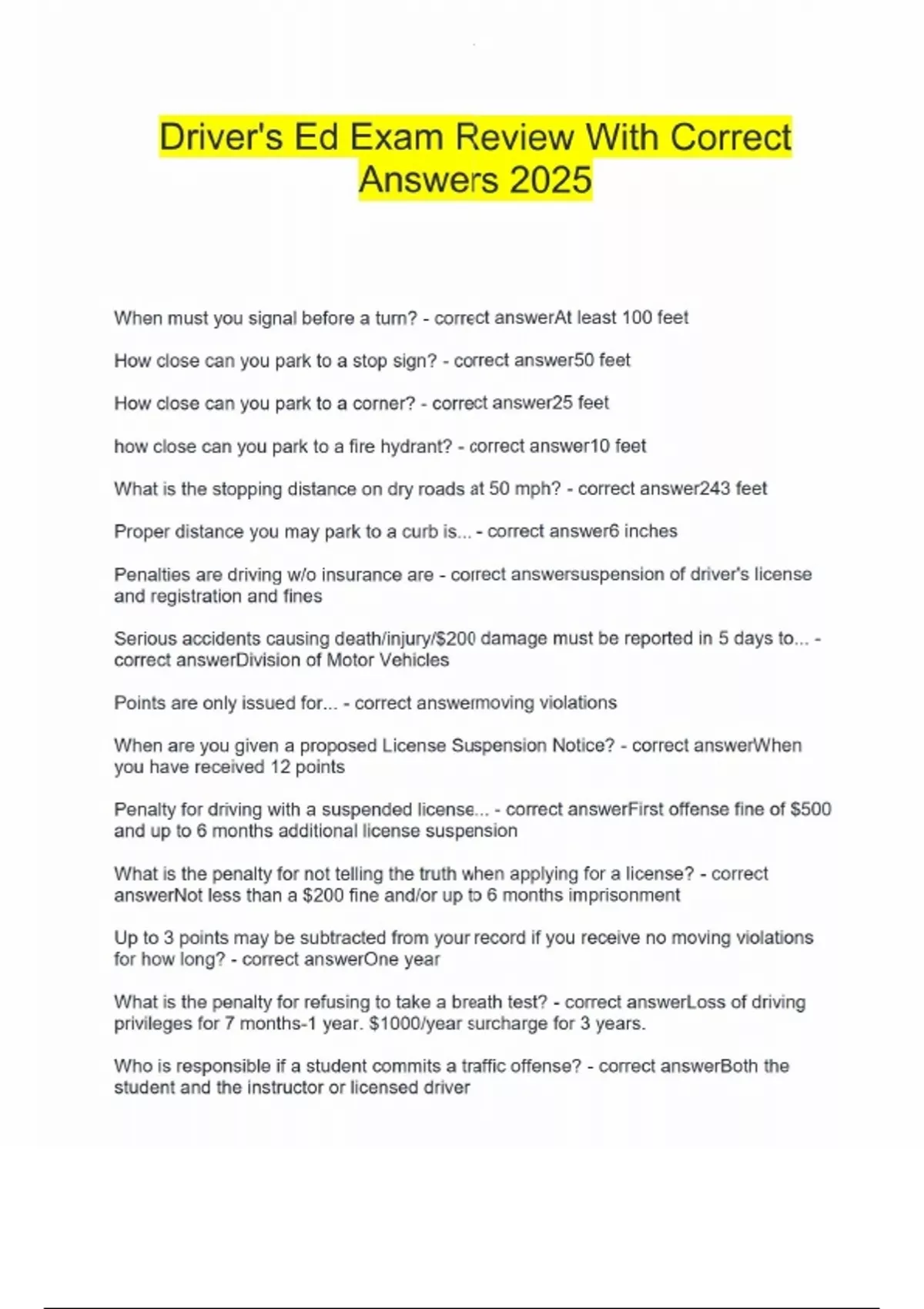 Driver's Ed Exam Review With Correct Answers 2025