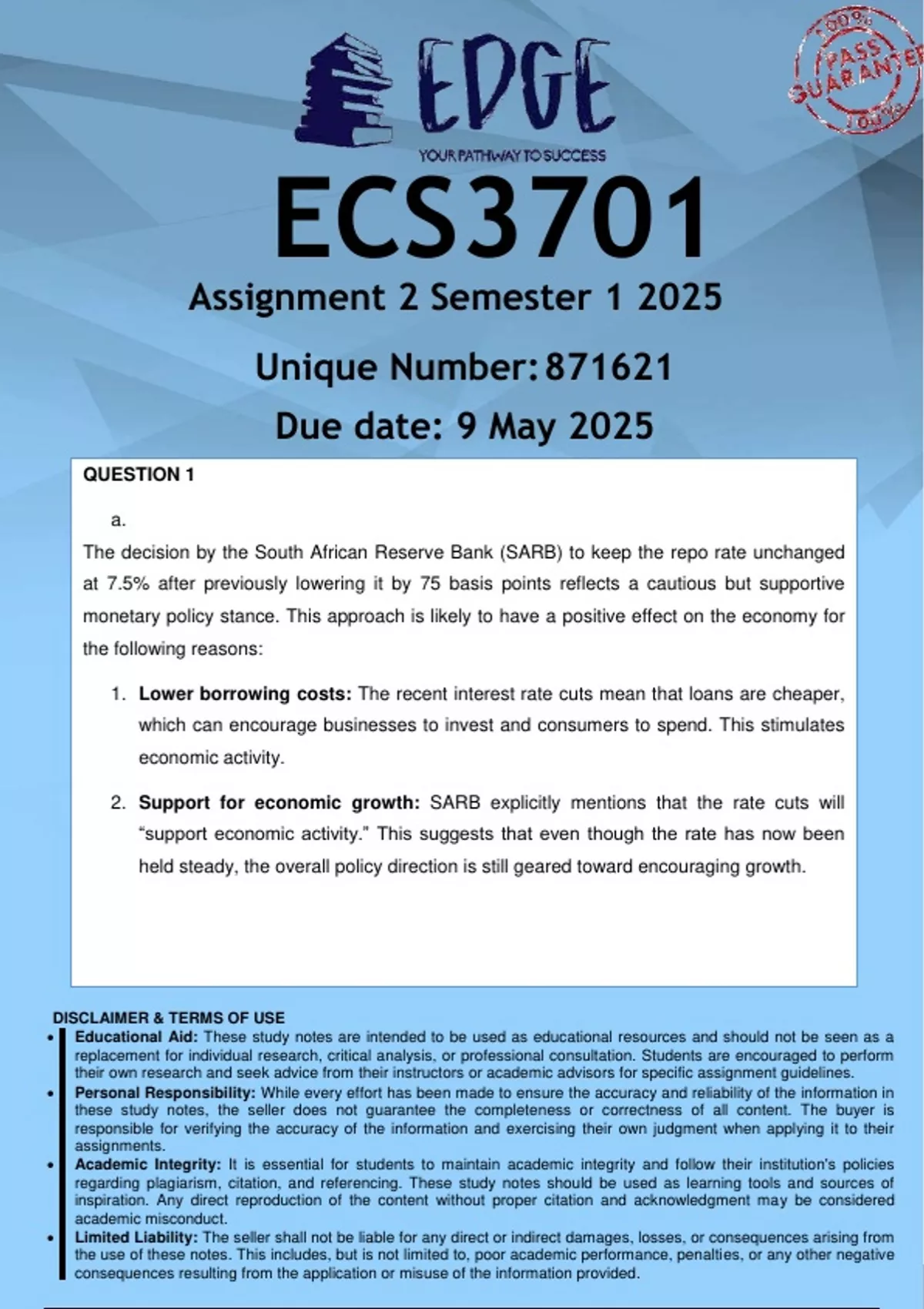 ECS3701 Assignment 2 (ANSWERS) Semester 1 2025 - DISTINCTION GUARANTEED