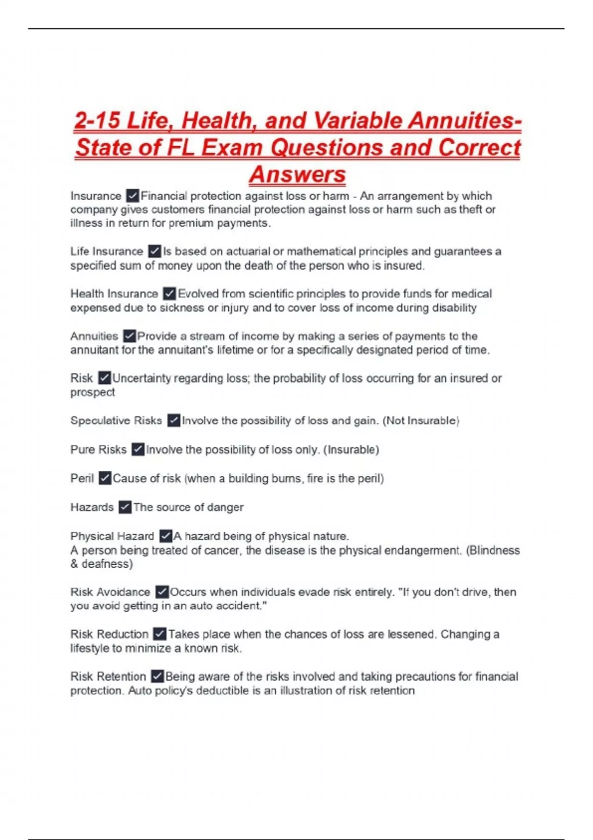 2-15 Life, Health, and Variable Annuities- State of FL Exam Questions and Correct Answers