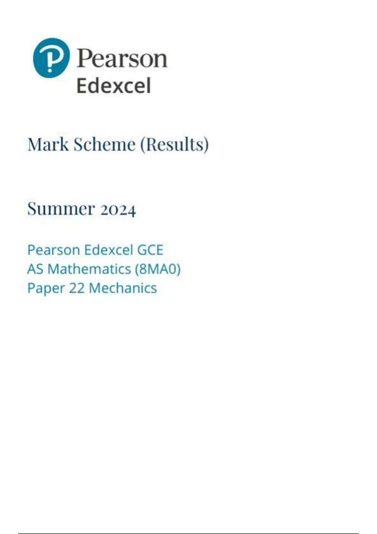 Pearson Edexcel GCE AS Mathematics (8MA0) Paper 22 Mechanics mark scheme june 2024 8ma0-22