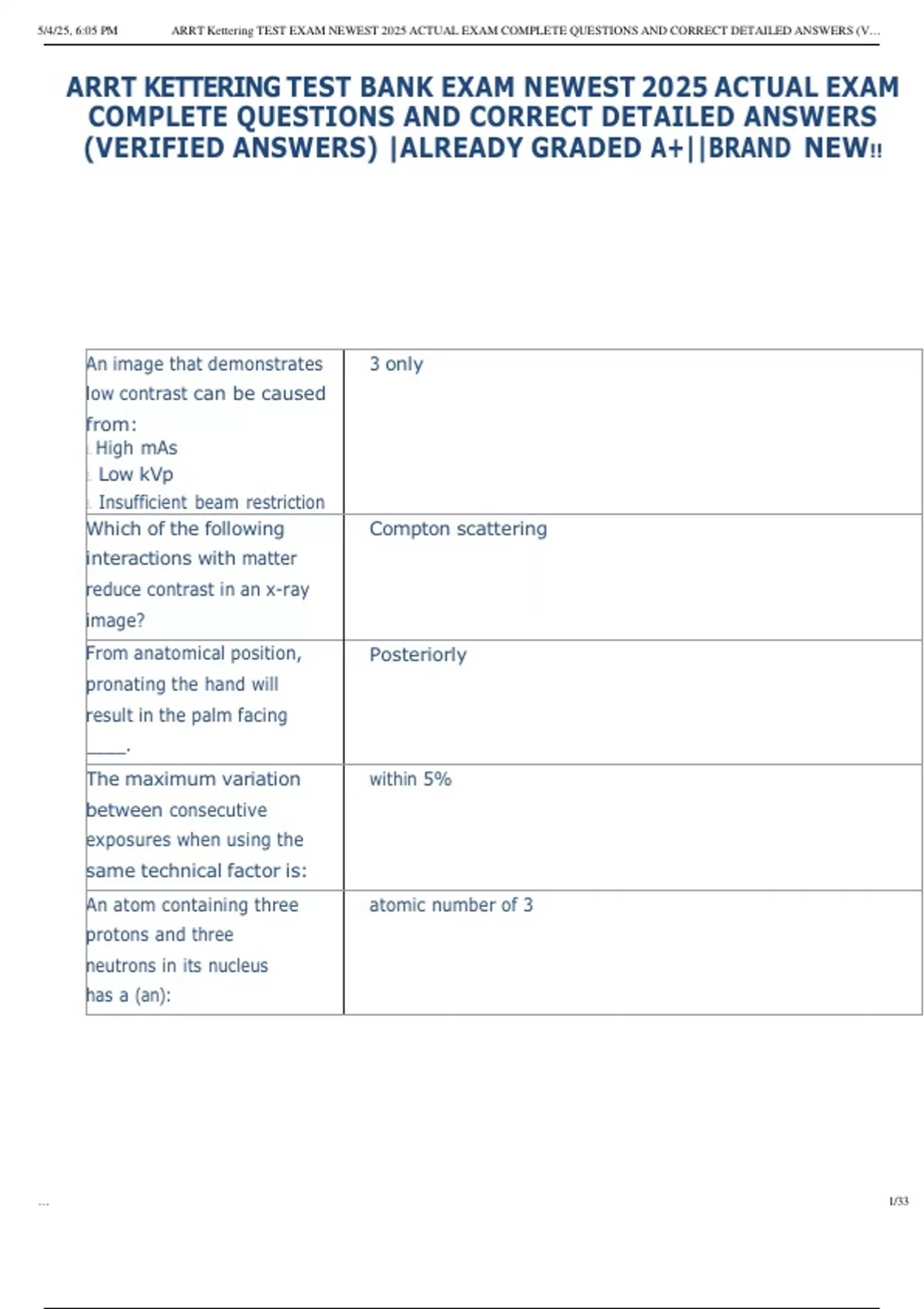 , 5/4/25, 6:05 PM ARRT Kettering TEST EXAM NEWEST 2025 ACTUAL EXAM COMPLETE QUESTIONS AND CORRECT DETAILED ANSWERS (V…