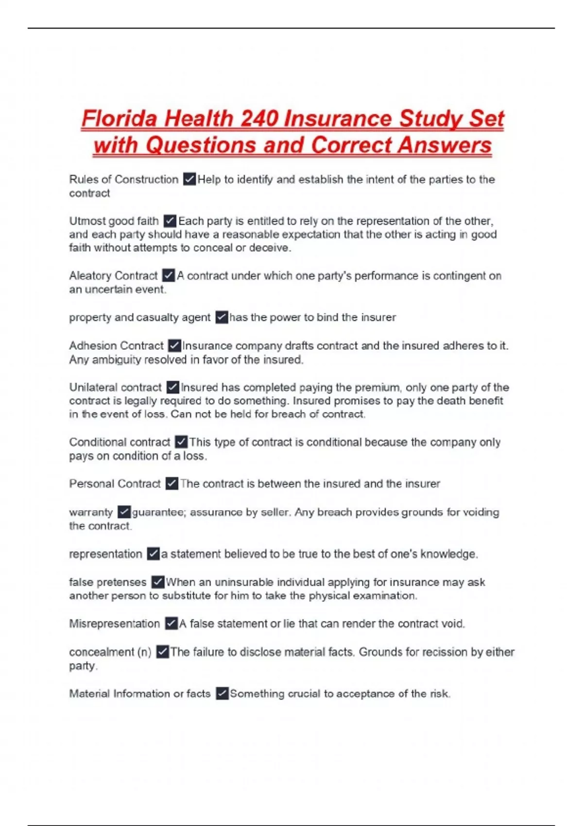 Florida Health 240 Insurance Study Set with Questions and Correct Answers