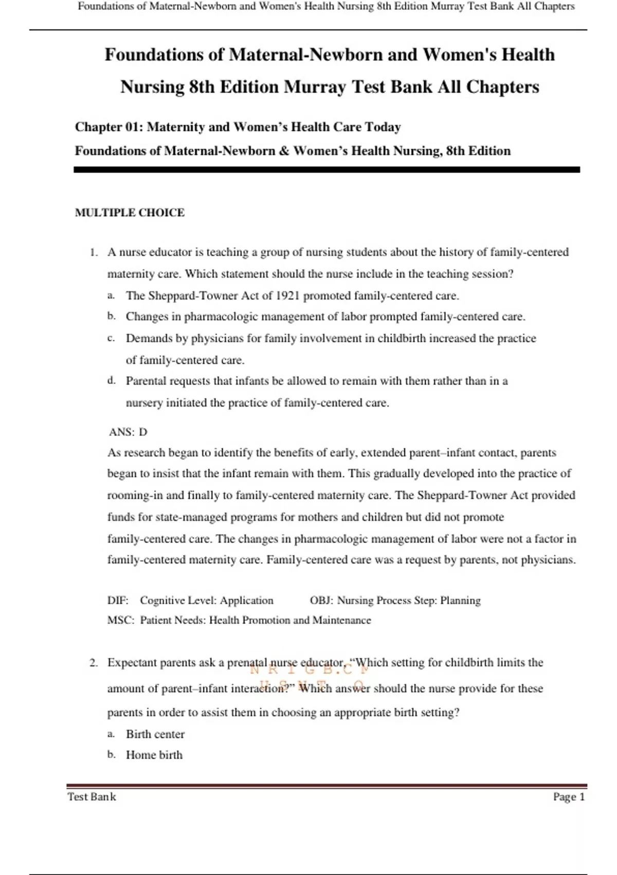 , Foundations of Maternal-Newborn and Women's Health Nursing 8th Edition Murray Test Bank All Chapters