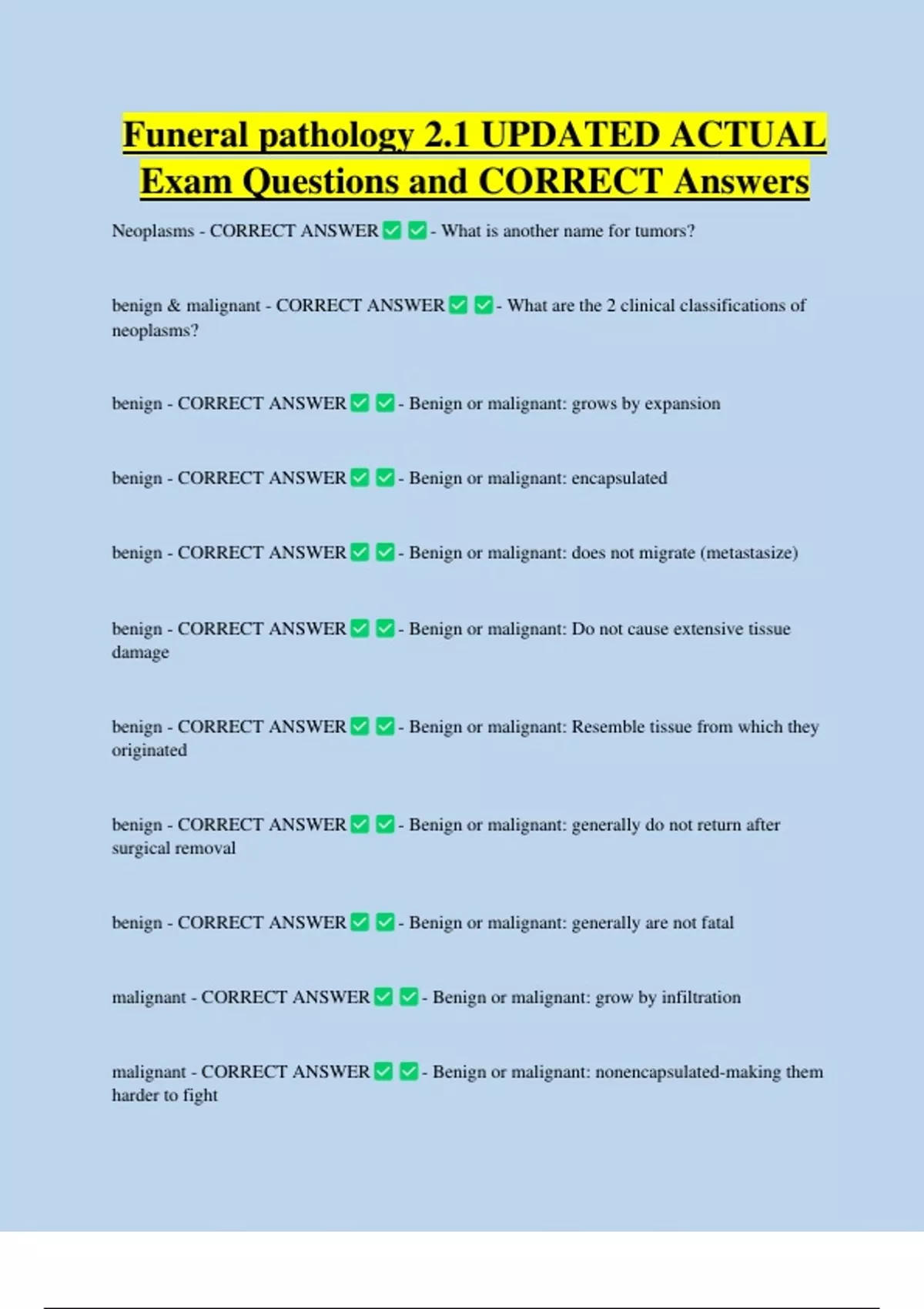 Funeral pathology 2.1 UPDATED ACTUAL Exam Questions and CORRECT Answers Neoplasms - CORRECT ANSWER - What is another name for tumors? benign & malignant - CORRECT ANSWER neoplasms? benign - CORRECT ANSWER - What are the 2 clinical classifications of - Benign or malignant: grows by expansion benign - CORRECT ANSWER benign - CORRECT ANSWER benign - CORRECT ANSWER damage benign - CORRECT ANSWER originated benign - CORRECT ANSWER surgical removal benign - CORRECT ANSWER malignant - CORRECT ANSWER malignant - CORRECT ANSWER harder to fight - Benign or malignant: encapsulated - Benign or malignant: does not migrate (metastasize)