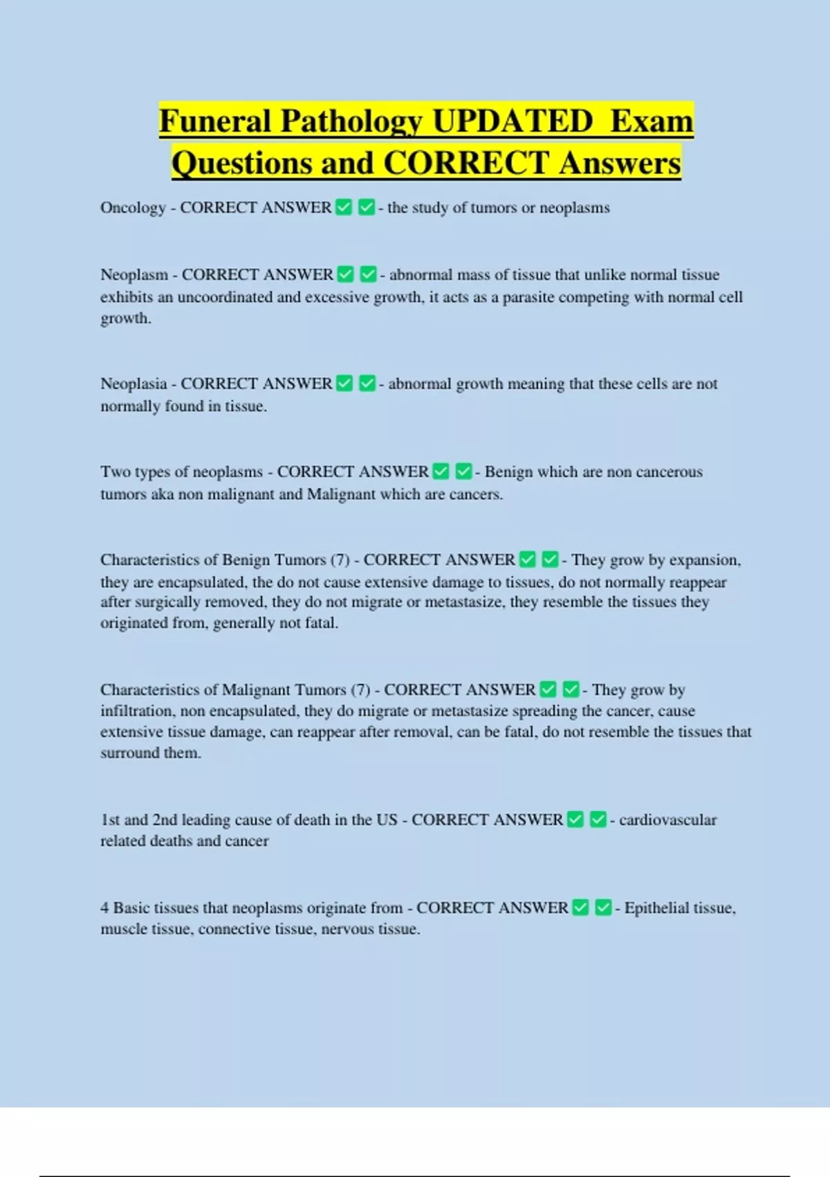 Funeral Pathology UPDATED Exam Questions and CORRECT Answers Oncology - CORRECT ANSWER Neoplasm - CORRECT ANSWER - the study of tumors or neoplasms - abnormal mass of tissue that unlike normal tissue exhibits an uncoordinated and excessive growth, it acts as a parasite competing with normal cell growth. Neoplasia - CORRECT ANSWER normally found in tissue. - abnormal growth meaning that these cells are not Two types of neoplasms - CORRECT ANSWER - Benign which are non cancerous tumors aka non malignant and Malignant which are cancers.
