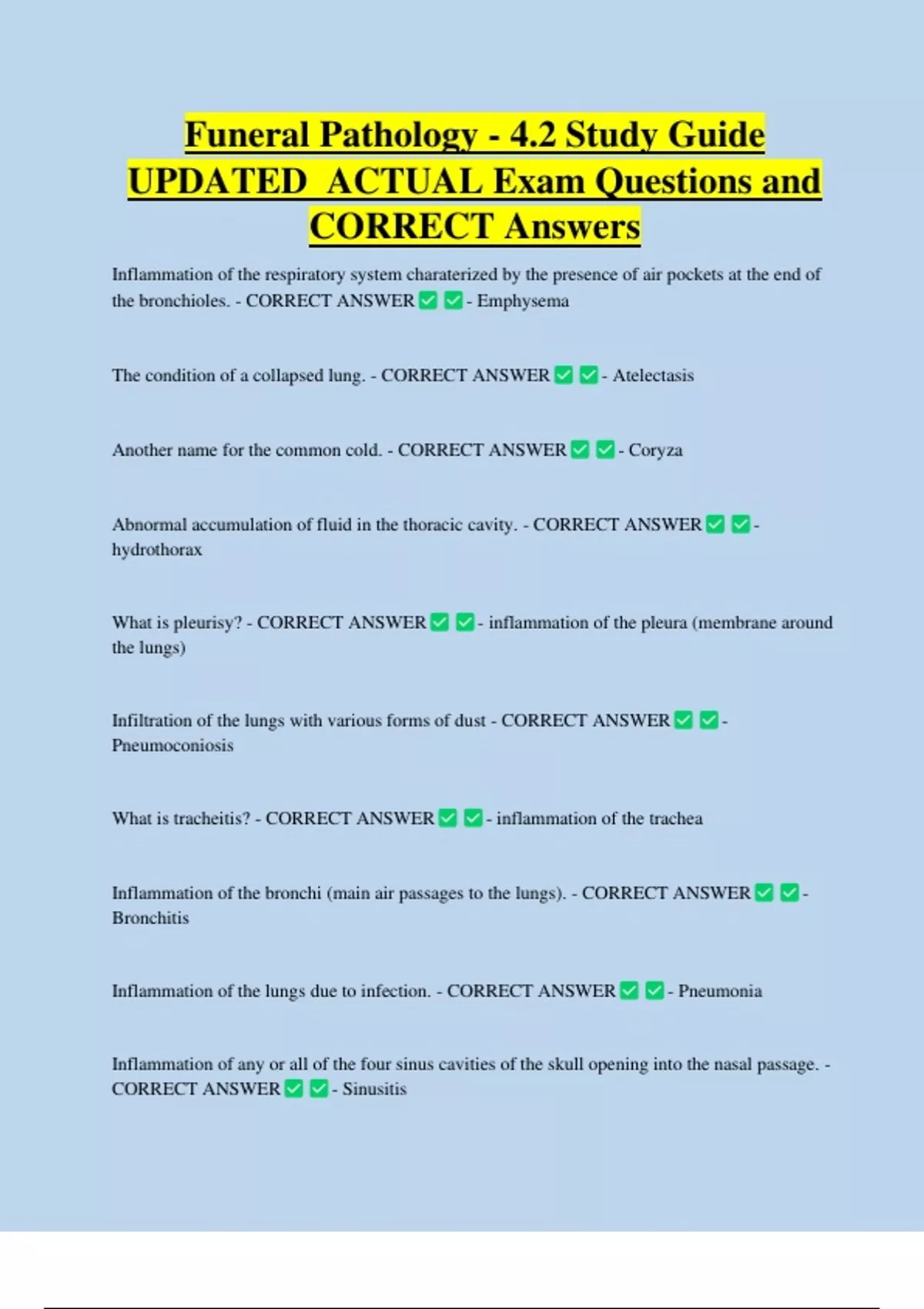 Funeral Pathology - 4.2 Study Guide UPDATED ACTUAL Exam Questions and CORRECT Answers Inflammation of the respiratory system charaterized by the presence of air pockets at the end of the bronchioles. - CORRECT ANSWER - Emphysema The condition of a collapsed lung. - CORRECT ANSWER Another name for the common cold. - CORRECT ANSWER - Atelectasis - Coryza Abnormal accumulation of fluid in the thoracic cavity. - CORRECT ANSWER hydrothora