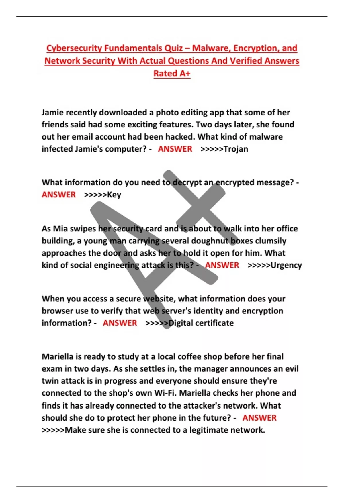 Cybersecurity Fundamentals Quiz – Malware, Encryption, and Network Security With Actual Questions And Verified Answers Rated A+