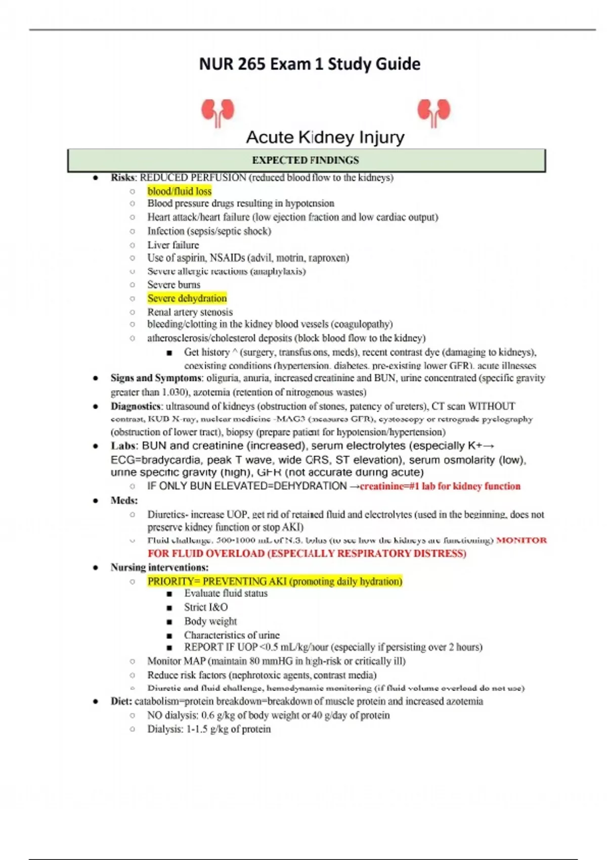 Acute Kidney Injury ● Risks: REDUCED PERFUSION (reduced blood flow to the kidneys) ○ blood/fluid loss ○ Blood pressure drugs resulting in hypotension ○ Heart attack/heart failure (low ejection fraction and low cardiac output) ○ Infection (sepsis/septic shock) ○ Liver failure ○ Use of aspirin, NSAIDs (advil, motrin, naproxen) ○ Severe allergic reactions (anaphylaxis) ○ Severe burns ○ Severe dehydration ○ Renal artery stenosis ○ bleeding/clotting in the kidney blood vessels (coagulopathy) ○ atherosclerosis/cholesterol deposits (block blood flow to the kidney) ■ Get history ^ (surgery, transfusions, meds), recent contrast dye (damaging to kidneys), coexisting conditions (hypertension, diabetes, pre-existing lower GFR), acute illnesses ● Signs and Symptoms: oliguria, anuria, increased creatinine and BUN, urine concentrated (specific gravity greater than 1.030), azotemia (retention of nitrogenous wastes) ● Diagnostics: ultrasound of kidneys (obstruction of stones, patency of ureters), CT scan WITHOUT contrast, KUB X-ray, nuclear medicine -MAG3 (measures GFR), cystoscopy or retrograde pyelography (obstruction of lower tract), biopsy (prepare patient for hypotension/hypertension) ● Labs: BUN and creatinine (increased), serum electrolytes (especially K+→ ECG=bradycardia, peak T wave, wide QRS, ST elevation), serum osmolarity (low), urine specific gravity (high), GFR (not accurate during acute) ○ IF ONLY BUN ELEVATED=DEHYDRATION →creatinine=#1 lab for kidney function ● Meds: ○ Diuretics- increase UOP, get rid of retained fluid and electrolytes (used in the beginning, does not preserve kidney function or stop AKI) ○ Fluid challenge: 500-1000 mL of N.S. bolus (to see how the kidneys are functioning) MONITOR FOR FLUID OVERLOAD (ESPECIALLY RESPIRATORY DISTRESS) ● Nursing interventions: ○ PRIORITY= PREVENTING AKI (promoting daily hydration) ■ Evaluate fluid status ■ Strict I&O ■ Body weight ■ Characteristics of urine ■ REPORT IF UOP 0.5 mL/kg/hour (especially if persisting over 2 hours) ○ Monitor MAP (maintain 80 mmHG in high-risk or critically ill) ○ Reduce risk factors (nephrotoxic agents, contrast media) ○ Diuretic and fluid challenge, hemodynamic monitoring (if fluid volume overload do not use) ● Diet: catabolism=protein breakdown=breakdown of muscle protein and increased azotemia ○ NO dialysis: 0.6 g/kg of body weight or 40 g/day of protein ○ Dialysis: 1-1.5 g/kg of protein UNEXPECTED →INTERVENE ○ Sodium: 60-90 mEq/kg ○ If high K+: restricted to 60-70 mEq/kg ○ Fluid: urine output + 500 mL Fluid volume overload ○ Crackles ○ Anasarca (swelling all over body) ○ Decreased O2 sat ○ Increased RR ○ LOC changes (confusion) ○ Restlessness (not normal to be restless for no reason) ■ Treated with: diuretics, dialysis, or paracentesis (removal of excess fluids), fluid and sodium restrictions Hypoperfusion/hypoxia →reduced blood volume ○ MAP 65 mmHg ○ Tachycardiac ○ Thready peripheral pulses ○ Decreased cognition ■ Treated with: IV fluids and possible blood transfusion EXPECTED FINDINGS Chronic Kidney Disease ● Risks: diabetes, hypertension, glomerulonephritis, PKD, gout, lupus, lead poisoning, pyelonephritis ● Signs and Symptoms: (CKD affect entire body →TOXINS LEFT IN BLOOD ) ○ Reduced GFR ○ Uremia (azotemia with symptoms)- metallic taste, anorexia, N/V, muscle cramps (hyperkalemia), uremic frost, pruritus, fatigue, hiccups, edema, dyspnea, paresthesia (gabapentin given) →end-stage (stage 4 and 5/maybe severe AKI) ○ Metabolic: buildup of urea and creatinine (expected=increased BUN & creatinine), Na+ issues (hyponatremia=early polyuria, later=hypernatremia & oliguria/anuria), hyperkalemia (always monitored) →metabolic acidosis →pH and HCO3 decrease (WATCH RR- COMPENSATION=KUSSMAUL’S), Ca+/phosphorus/vitamin D concerns (phosphorus increase=Ca+ and vitamin D decrease= osteoporosis (fracture/cramps) →FALL RISK ○ Cardiac changes: hyperlipidemia, hypertension, H.F.(F.V.O.)/S3 (S3=first sign of H.F.), crackles, pulmonary edema (pink frothy sputum=medical emergency), tachypnea, hyperpnea, peripheral edema, JVD, pericarditis, cardiac tamponade BP★ aldosterone= increase Na+ and fluid=increase ○ Hematologic: anemia, low iron & folic acid, decreased immunity (erythropoietin made in the kidneys. EPO=stimulates production of RBC=H&H decreased=anemia) ○ GI: uremic fetor (ammonia smelling bad breath), stomatitis, PUD →uremia symptoms (can cause constipation and diarrhea) ○ Neurological: ataxia, peripheral neuropathy, tremors, seizure, coma ○ Musculoskeletal: bone pain, muscle weakness, pathological fractures (decreased Ca+ and vitamin D)