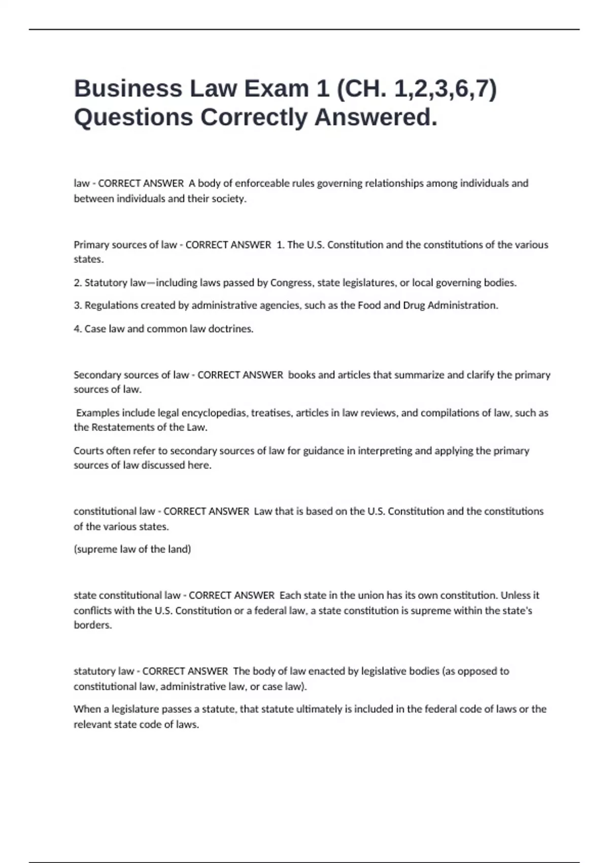 Primary sources of law - CORRECT ANSWER 1. The U.S. Constitution and the constitutions of the various