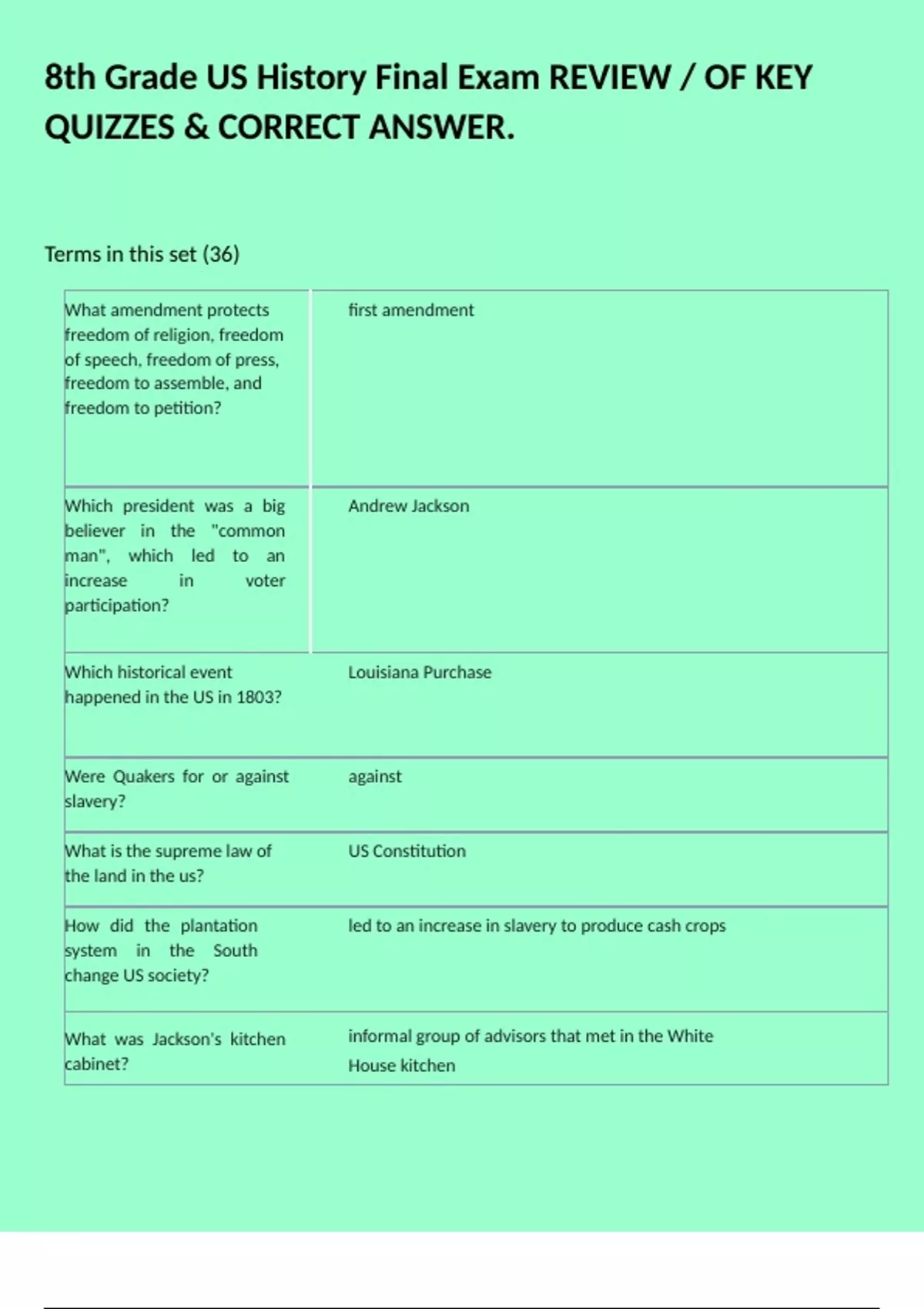 8th Grade US History Final Exam REVIEW / OF KEY QUIZZES & CORRECT ANSWER.
