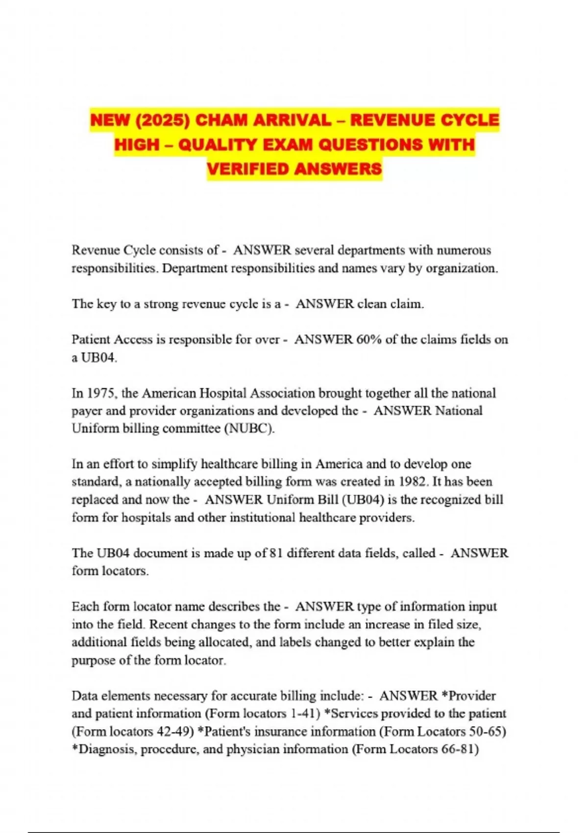 NEW (2025) CHAM ARRIVAL – REVENUE CYCLE HIGH – QUALITY EXAM QUESTIONS WITH VERIFIED ANSWERS