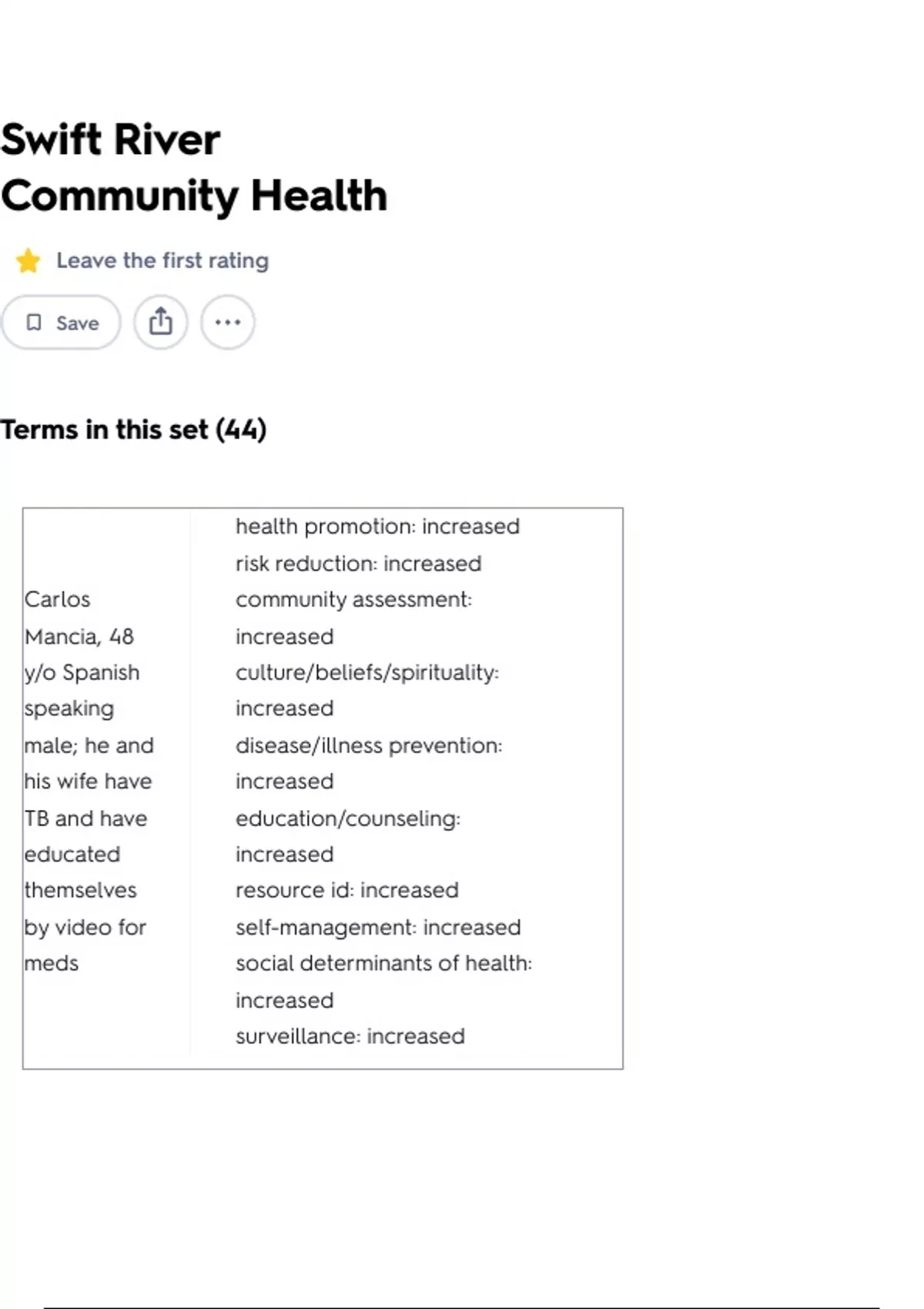 Swift River Community Health Leave the first rating Save Terms in this set (44) Carlos Mancia, 48 y/o Spanish speaking male; he and his wife have TB and have educated themselves by video for meds health promotion: increased risk reduction: increased community assessment: increased culture/beliefs/spirituality: increased disease/illness prevention: increased education/counseling: increased resource id: increased self-management: increased social determinants of health: increased surveillance: increased Suzanne Olsen, 24 y/o female; increased vaginal discharge, pain w/ intercourse, five abortions, two deliveries (gave up for adoption) health promotion: increased risk reduction: increased community assessment: increased culture/beliefs/spirituality: normal disease/illness prevention: increased education/counseling: increased resource id: increased self-management: increased social determinants of health: increased surveillance: increased Kenny Barrett, 64 y/o male; undiagnosed HTN r/t vasculitis, Buerger's disease, smokes one pack/day, country boy (far from doctors) health promotion: increased risk reduction: increased community assessment: increased culture/beliefs/spirituality: normal disease/illness prevention: increased education/counseling: increased resource id: increased self-management: increased social determinants of health: increased surveillance: normal Arthur Silverstein, 68 y/o male; Vietnam vet dx: PTSD r/t abuse during imprisonment from war, lives in homeless shelter, alcohol addiction, hyper-vigilant and gets anxious in crowds, has not seen kids in years Mary Jane, 21 y/o female; self mutilation, anxiety, dx: major depressive disorder, anxiety/depre ssion r/t unemployme nt, lives with parents, dropped out of college health promotion: increased risk reduction: increased community assessment: increased culture/beliefs/spirituality: normal disease/illness prevention: increased education/counseling: increased resource id: increased self-management: increased social determinants of health: increased surveillance: normal