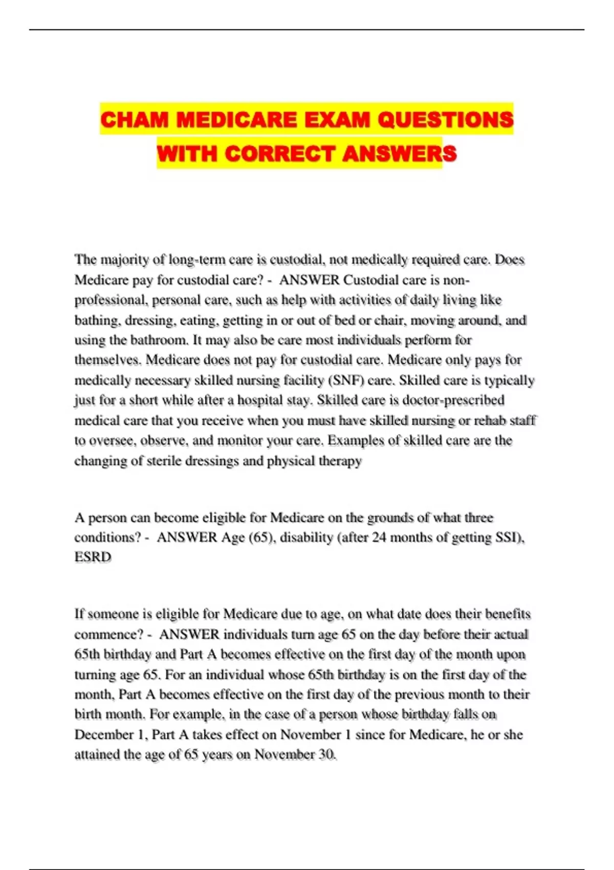 CHAM MEDICARE EXAM QUESTIONS WITH CORRECT ANSWERS