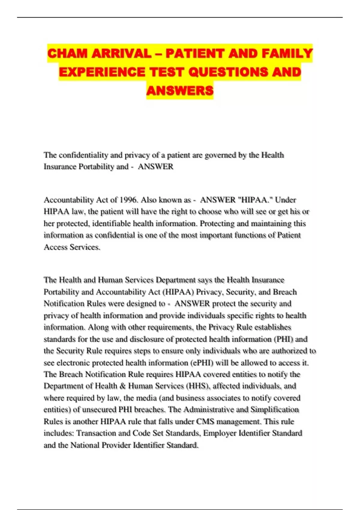 CHAM ARRIVAL – PATIENT AND FAMILY EXPERIENCE TEST QUESTIONS AND ANSWERS....