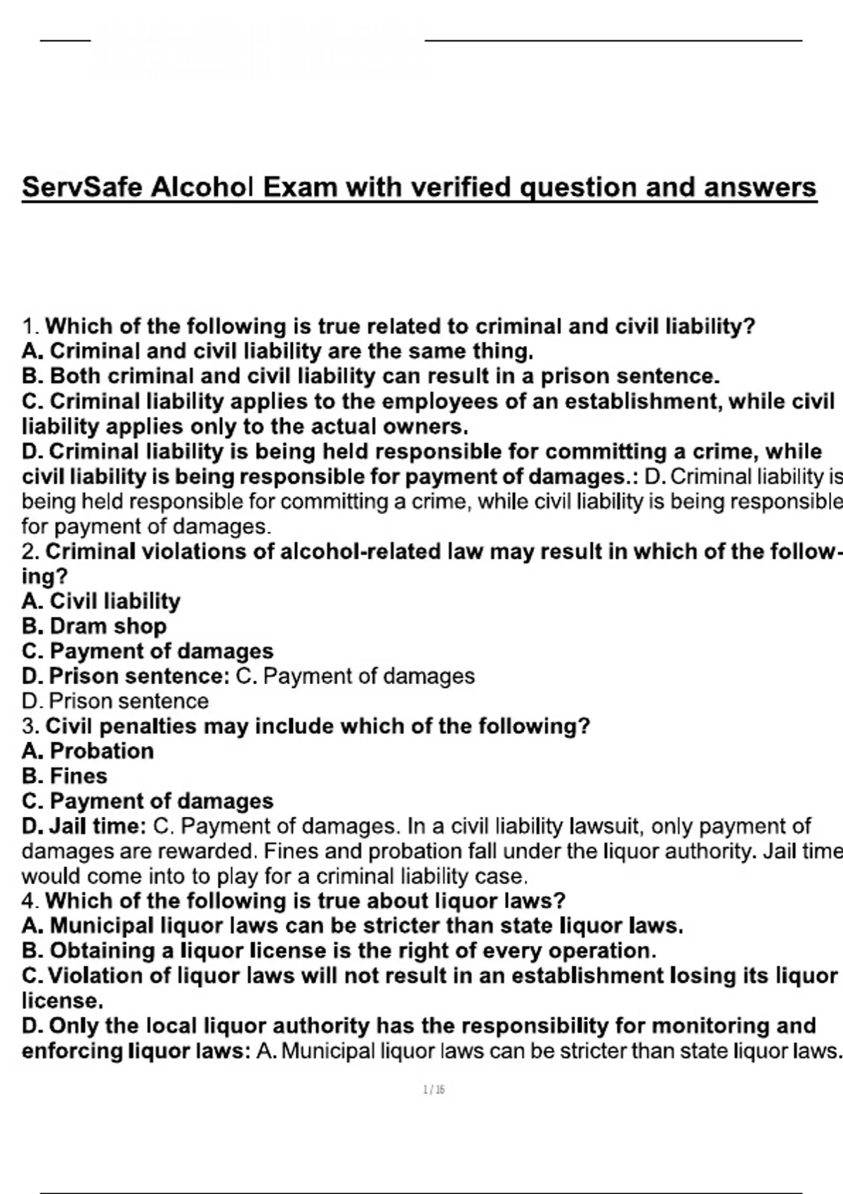 ServSafe Alcohol Exam with verified question and answers 1. Which of the following is true related to criminal and civil liability? A. Criminal and civil liability are the same thing. B. Both criminal and civil liability can result in a prison sentence. C. Criminal liability applies to the employees of an establishment, while civil liability applies only to the actual owners. D. Criminal liability is being held responsible for committing a crime, while civil liability is being responsible for payment of damages.: D. Criminal liability is being held responsible for committing a crime, while civil liability is being responsible for payment of damages. 2. Criminal violations of alcohol-related law may result in which of the follow- ing?