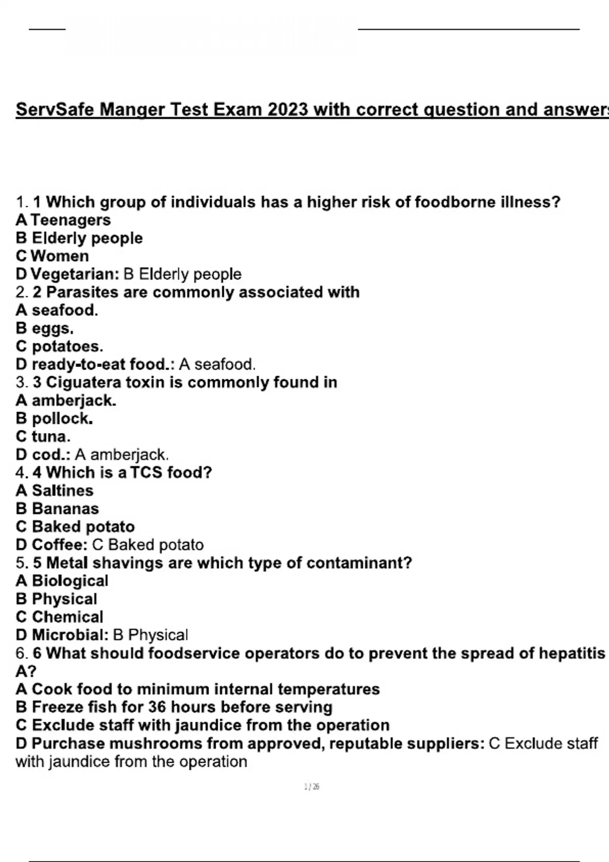ServSafe Manger Test Exam 2023 with correct question and answers 1. 1 Which group of individuals has a higher risk of foodborne illness? A Teenagers B Elderly people C Women D Vegetarian: B Elderly people 2. 2 Parasites are commonly associated with A seafood. B eggs. C potatoes. D ready-to-eat food.: A seafood.