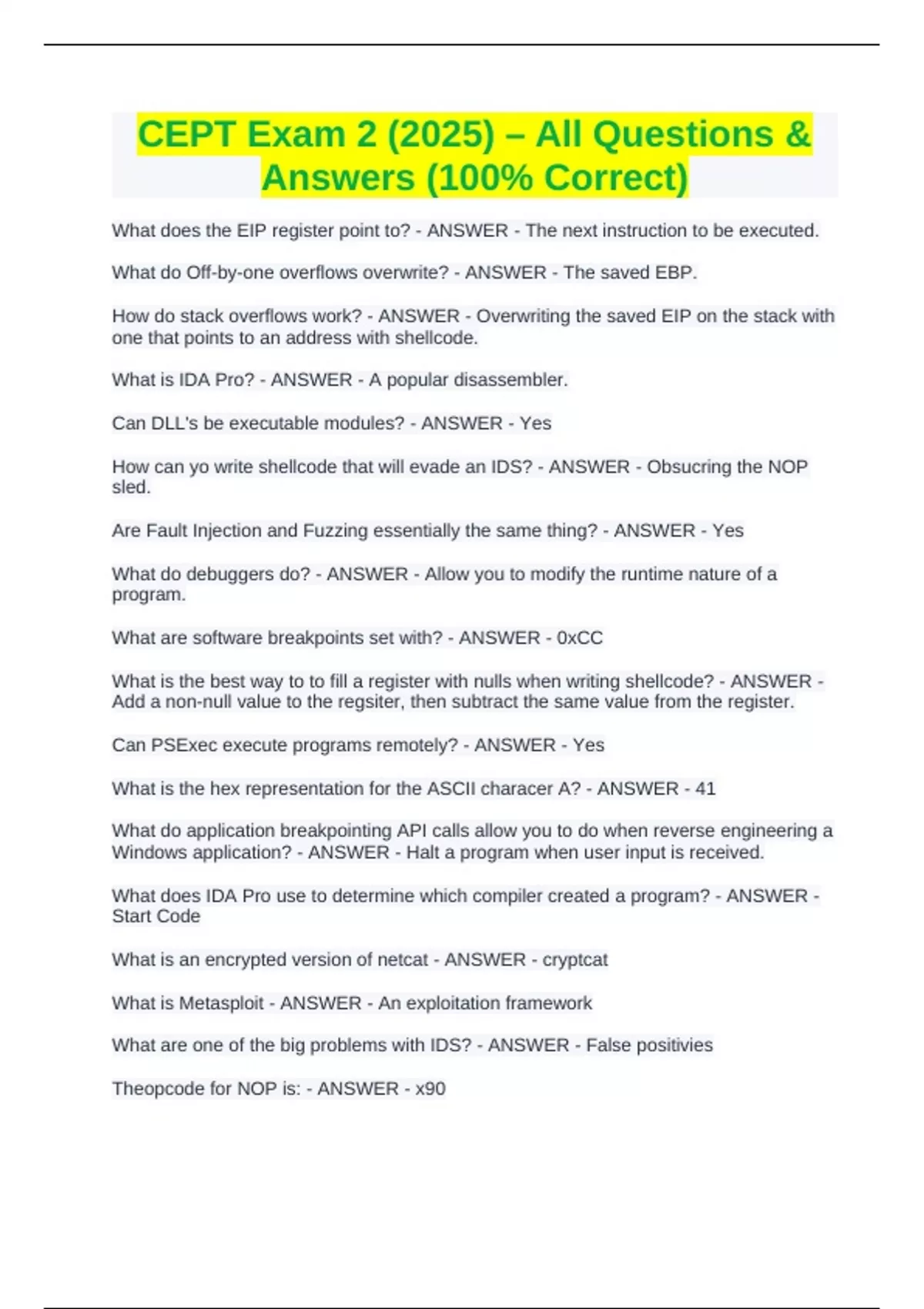 What does the EIP register point to? - ANSWER - The next instruction to be executed. What do Off-by-one overflows overwrite? - ANSWER - The saved EBP. How do stack overflows work? - ANSWER - Overwriting the saved EIP on the stack with one that points to an address with shellcode. What is IDA Pro? - ANSWER - A popular disassembler. Can DLL's be executable modules? - ANSWER - Yes How can yo write shellcode that will evade an IDS? - ANSWER - Obsucring the NOP sled. Are Fault Injection and Fuzzing essentially the same thing? - ANSWER - Yes What do debuggers do? - ANSWER - Allow you to modify the runtime nature of a program. What are software breakpoints set with? - ANSWER - 0xCC What is the best way to to fill a register with nulls when writing shellcode? - ANSWER - Add a non-null value to the regsiter, then subtract the same value from the register. Can PSExec execute programs remotely? - ANSWER - Yes What is the hex representation for the ASCII characer A? - ANSWER - 41 What do application breakpointing API calls allow you to do when reverse engineering a Windows application? - ANSWER - Halt a program when user input is received. What does IDA Pro use to determine which compiler created a program? - ANSWER - Start Code What is an encrypted version of netcat - ANSWER - cryptcat