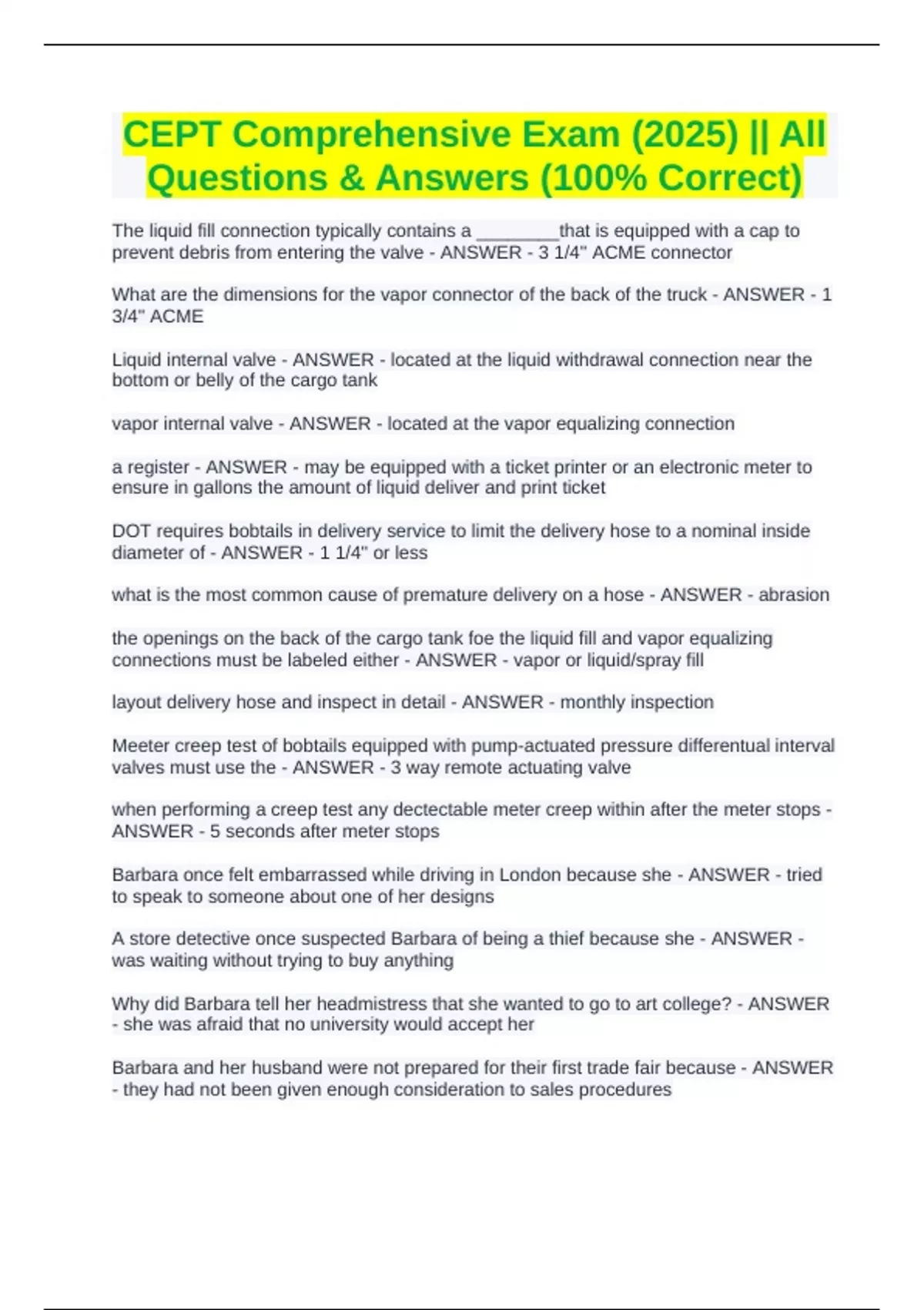 The liquid fill connection typically contains a ________that is equipped with a cap to prevent debris from entering the valve - ANSWER - 3 1/4'' ACME connector What are the dimensions for the vapor connector of the back of the truck - ANSWER - 1 3/4'' ACME Liquid internal valve - ANSWER - located at the liquid withdrawal connection near the bottom or belly of the cargo tank vapor internal valve - ANSWER - located at the vapor equalizing connection a register - ANSWER - may be equipped with a ticket printer or an electronic meter to ensure in gallons the amount of liquid deliver and print ticket DOT requires bobtails in delivery service to limit the delivery hose to a nominal inside diameter of - ANSWER - 1 1/4'' or less what is the most common cause of premature delivery on a hose - ANSWER - abrasion the openings on the back of the cargo tank foe the liquid fill and vapor equalizing connections must be labeled either - ANSWER - vapor or liquid/spray fill layout delivery hose and inspect in detail - ANSWER - monthly inspection Meeter creep test of bobtails equipped with pump-actuated pressure differentual interval valves must use the - ANSWER - 3 way remote actuating valve when performing a creep test any dectectable meter creep within after the meter stops - ANSWER - 5 seconds after meter stops Barbara once felt embarrassed while driving in London because she - ANSWER - tried to speak to someone about one of her designs A store detective once suspected Barbara of being a thief because she - ANSWER - was waiting without trying to buy anything Why did Barbara tell her headmistress that she wanted to go to art college? - ANSWER - she was afraid that no university would accept her Barbara and her husband were not prepared for their first trade fair because - ANSWER - they had not been given enough consideration to sales procedures