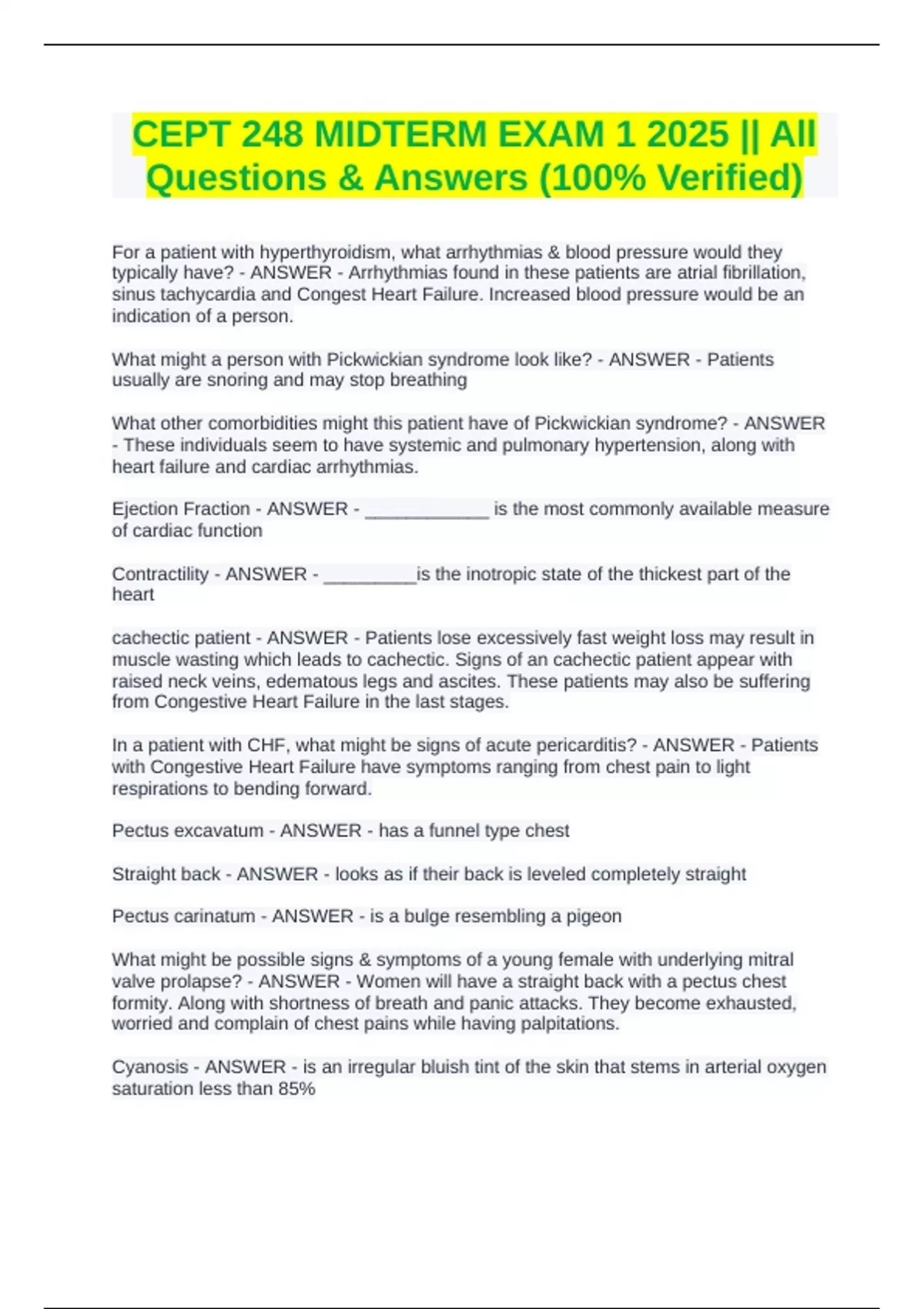 For a patient with hyperthyroidism, what arrhythmias & blood pressure would they typically have? - ANSWER - Arrhythmias found in these patients are atrial fibrillation, sinus tachycardia and Congest Heart Failure. Increased blood pressure would be an indication of a person. What might a person with Pickwickian syndrome look like? - ANSWER - Patients usually are snoring and may stop breathing What other comorbidities might this patient have of Pickwickian syndrome? - ANSWER - These individuals seem to have systemic and pulmonary hypertension, along with heart failure and cardiac arrhythmias. Ejection Fraction - ANSWER - ____________ is the most commonly available measure of cardiac function Contractility - ANSWER - _________is the inotropic state of the thickest part of the heart cachectic patient - ANSWER - Patients lose excessively fast weight loss may result in muscle wasting which leads to cachectic. Signs of an cachectic patient appear with raised neck veins, edematous legs and ascites. These patients may also be suffering from Congestive Heart Failure in the last stages. In a patient with CHF, what might be signs of acute pericarditis? - ANSWER - Patients with Congestive Heart Failure have symptoms ranging from chest pain to light respirations to bending forward. Pectus excavatum - ANSWER - has a funnel type chest Straight back - ANSWER - looks as if their back is leveled completely straight Pectus carinatum - ANSWER - is a bulge resembling a pigeon What might be possible signs & symptoms of a young female with underlying mitral valve prolapse? - ANSWER - Women will have a straight back with a pectus chest formity. Along with shortness of breath and panic attacks. They become exhausted, worried and complain of chest pains while having palpitations. Cyanosis - ANSWER - is an irregular bluish tint of the skin that stems in arterial oxygen saturation less than 85%