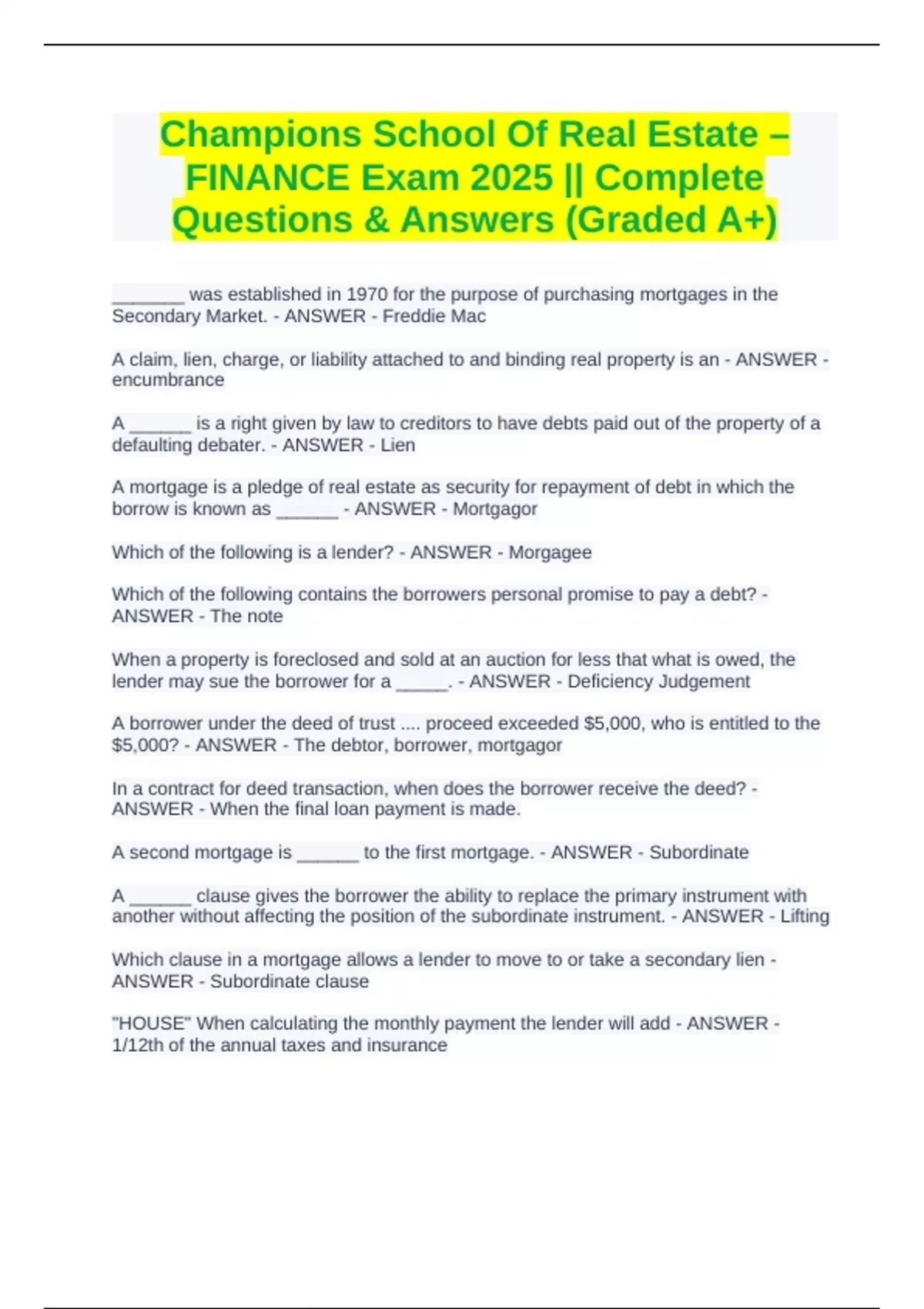 Champions School of Real Estate - Real Estate Finance Exam 2025 || Questions & Answers (100% Verified)
