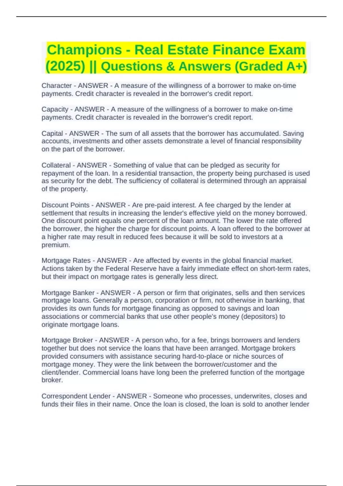 Champions - Real Estate Finance Exam (2025) || Questions & Answers (Graded A+)