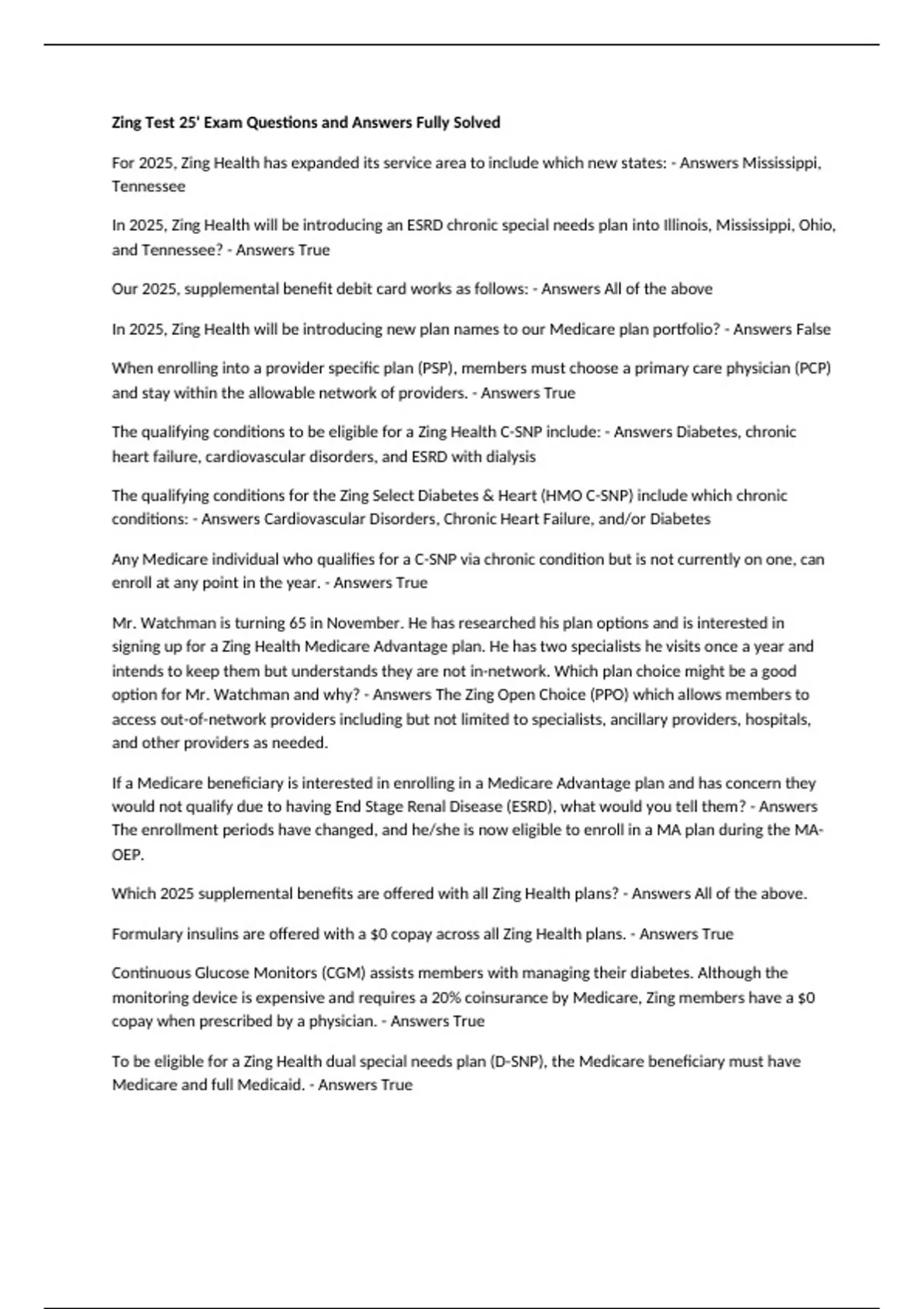 Zing Test 25' Exam Questions and Answers Fully Solved For 2025, Zing Health has expanded its service area to include which new states: - Answers Mississippi, Tennessee In 2025, Zing Health will be introducing an ESRD chronic special needs plan into Illinois, Mississippi, Ohio, and Tennessee? - Answers True Our 2025, supplemental benefit debit card works as follows: - Answers All of the above In 2025, Zing Health will be introducing new plan names to our Medicare plan portfolio? - Answers False When enrolling into a provider specific plan (PSP), members must choose a primary care physician (PCP) and stay within the allowable network of providers. - Answers True The qualifying conditions to be eligible for a Zing Health C-SNP include: - Answers Diabetes, chronic heart failure, cardiovascular disorders, and ESRD with dialysis The qualifying conditions for the Zing Select Diabetes & Heart (HMO C-SNP) include which chronic conditions: - Answers Cardiovascular Disorders, Chronic Heart Failure, and/or Diabetes Any Medicare individual who qualifies for a C-SNP via chronic condition but is not currently on one, can enroll at any point in the year. - Answers True Mr. Watchman is turning 65 in November. He has researched his plan options and is interested in signing up for a Zing Health Medicare Advantage plan. He has two specialists he visits once a year and intends to keep them but understands they are not in-network. Which plan choice might be a good option for Mr. Watchman and why? - Answers The Zing Open Choice (PPO) which allows members to access out-of-network providers including but not limited to specialists, ancillary providers, hospitals, and other providers as needed. If a Medicare beneficiary is interested in enrolling in a Medicare Advantage plan and has concern they would not qualify due to having End Stage Renal Disease (ESRD), what would you tell them? - Answers The enrollment periods have changed, and he/she is now eligible to enroll in a MA plan during the MA-OEP. Which 2025 supplemental benefits are offered with all Zing Health plans? - Answers All of the above. Formulary insulins are offered with a $0 copay across all Zing Health plans. - Answers True