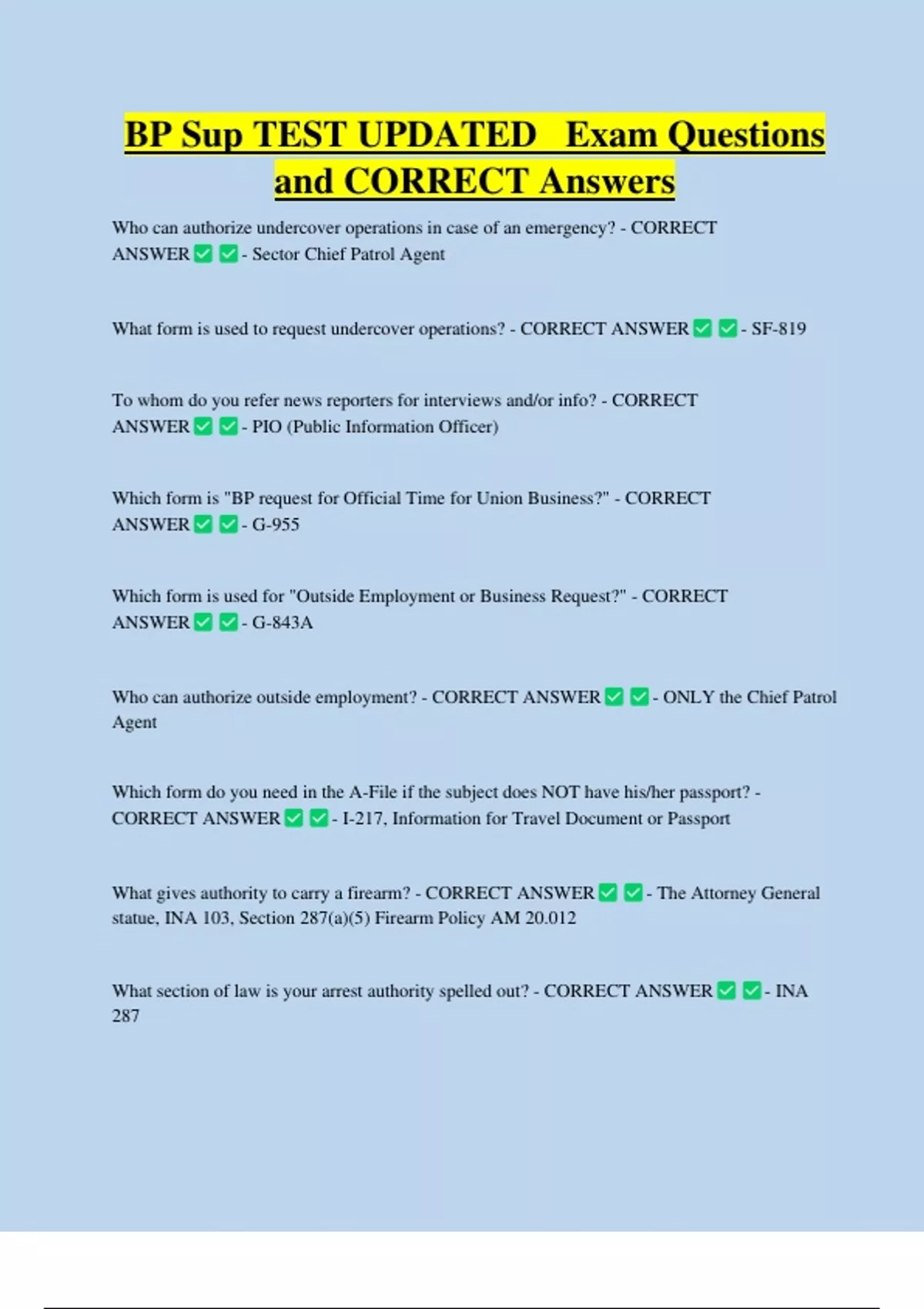 BP Sup TEST UPDATED Exam Questions and CORRECT Answers Who can authorize undercover operations in case of an emergency? - CORRECT ANSWER - Sector Chief Patrol Agent What form is used to request undercover operations? - CORRECT ANSWER To whom do you refer news reporters for interviews and/or info? - CORRECT ANSWER - PIO (Public Information Officer) Which form is "BP request for Official Time for Union Business?" - CORRECT ANSWER - G-955