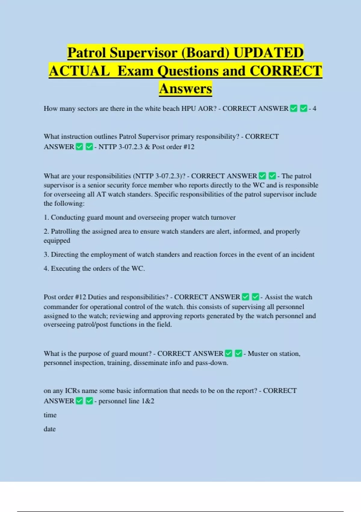 Patrol Supervisor (Board) UPDATED ACTUAL Exam Questions and CORRECT Answers How many sectors are there in the white beach HPU AOR? - CORRECT ANSWER What instruction outlines Patrol Supervisor primary responsibility? - CORRECT ANSWER - NTTP 3-07.2.3 & Post order #12 What are your responsibilities (NTTP 3-07.2.3)? - CORRECT ANSWER - 4 - The patrol supervisor is a senior security force member who reports directly to the WC and is responsible for overseeing all AT watch standers. Specific responsibilities of the patrol supervisor include the following