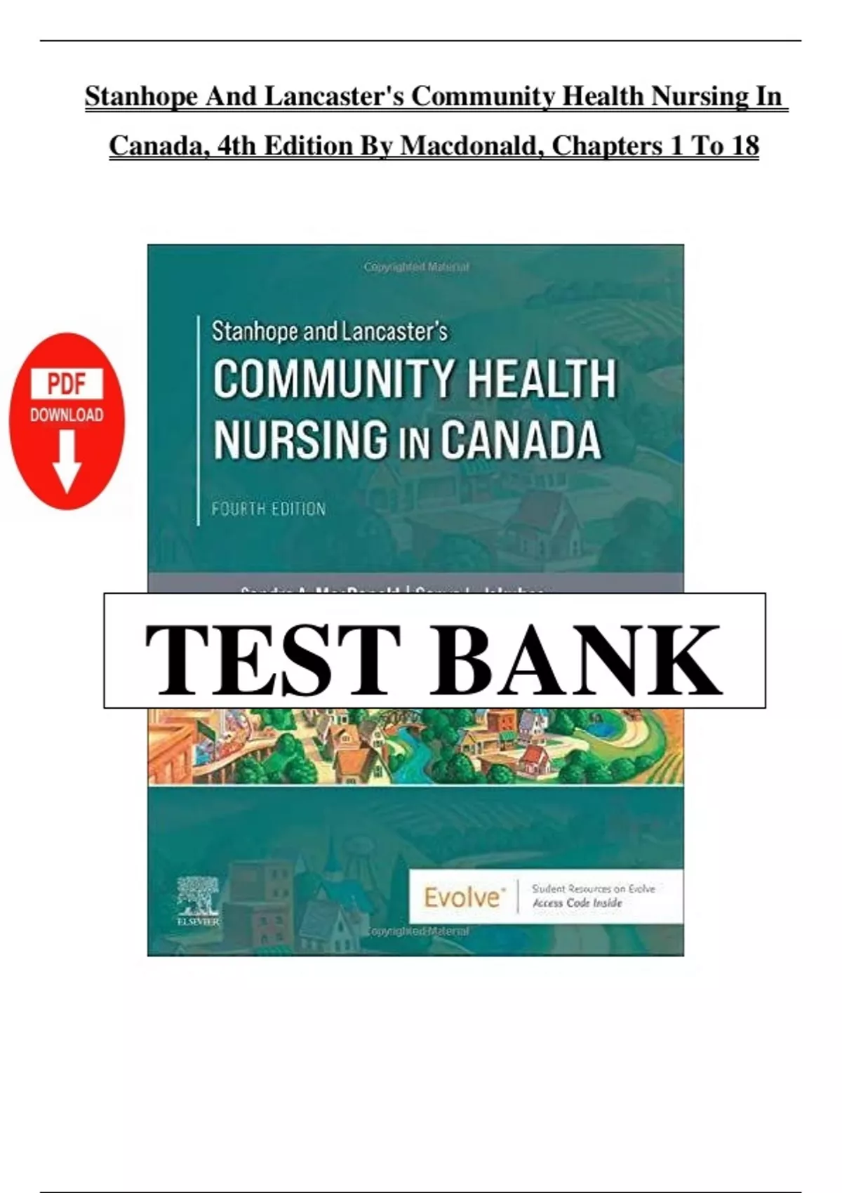 This document provides the verified and complete test bank for all 18 chapters of Community Health Nursing in Canada (4th Edition) by Macdonald, based on the Stanhope and Lancaster framework. It includes multiple-choice questions with correct answers and detailed references. The material supports comprehensive review and preparation for nursing exams with a focus on community health, epidemiology, ethics, public health nursing roles, health promotion, and more. Keywords: community health, public health nursing, Stanhope and Lancaster, Canadian nursing, health promotion, primary prevention, epidemiology, evidence-informed practice, communicable diseases, vulnerable populations, nursing ethics, environmental health, emergency preparedness, indigenous health, nursing interventions, health equity, program planning, population health, structural determinants