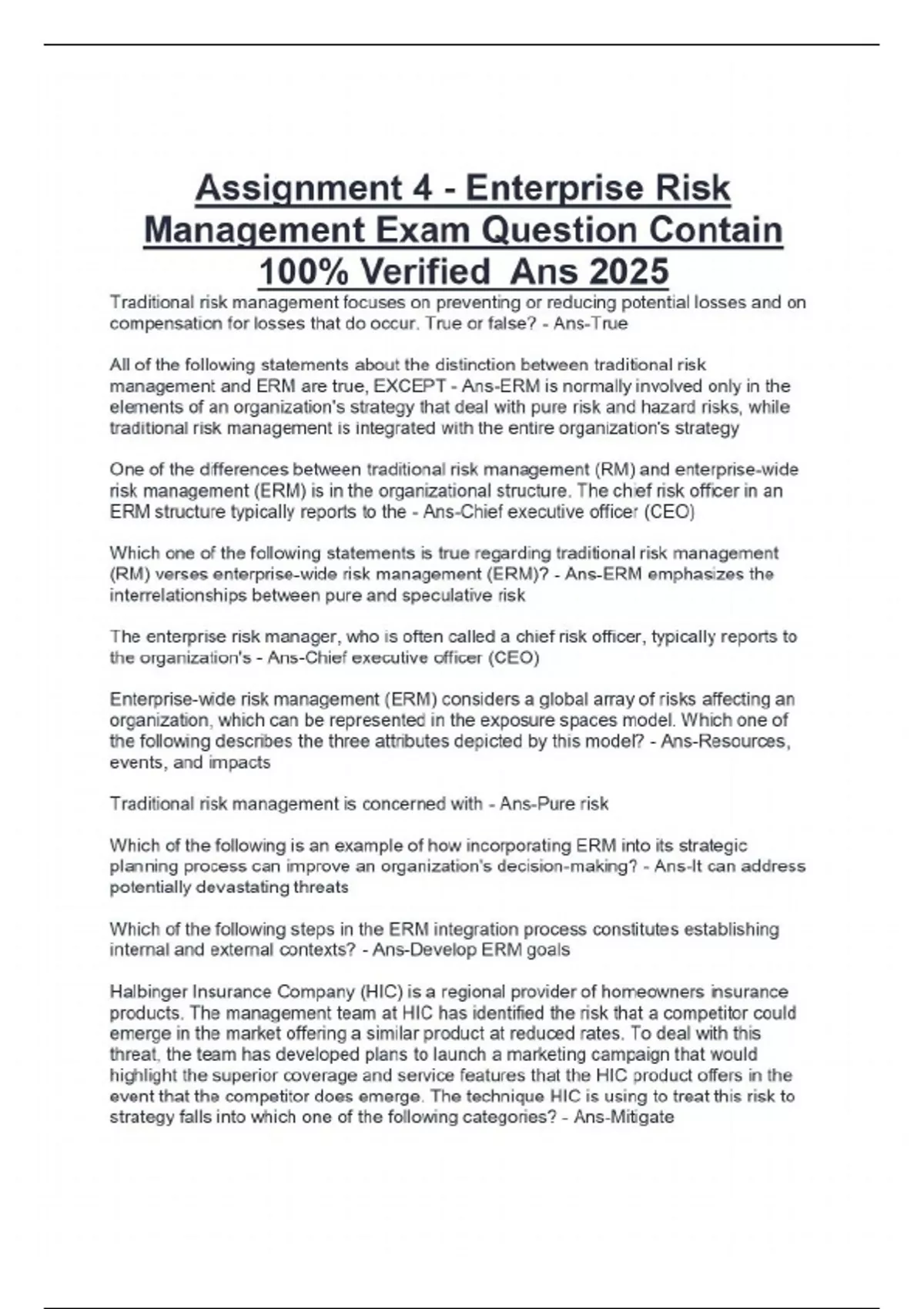 Assignment 4 - Enterprise Risk Management Exam Question Contain 100% Verified Ans 2025
