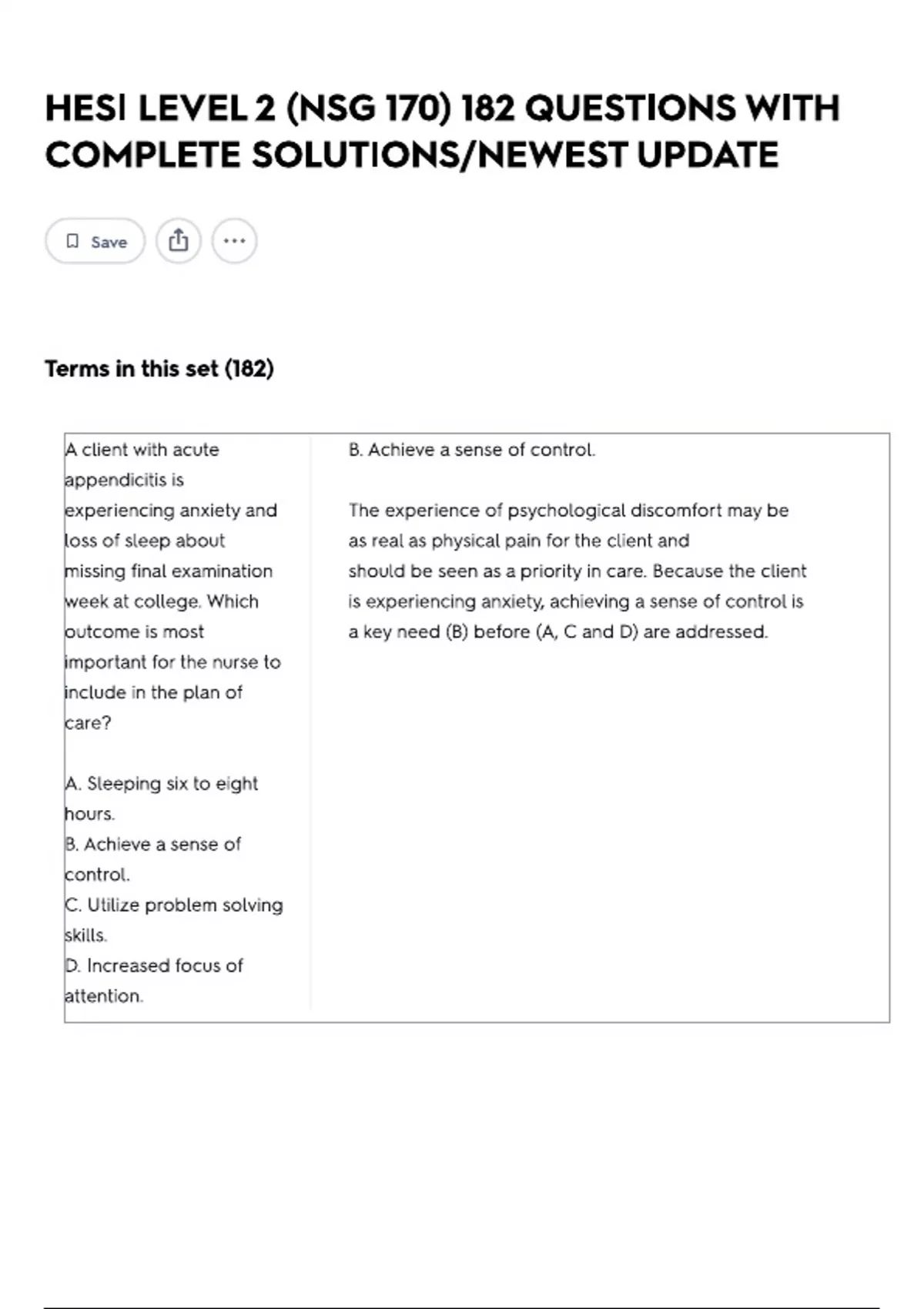 HESI LEVEL 2 (NSG 170) 182 QUESTIONS WITH COMPLETE SOLUTIONS/NEWEST UPDATE