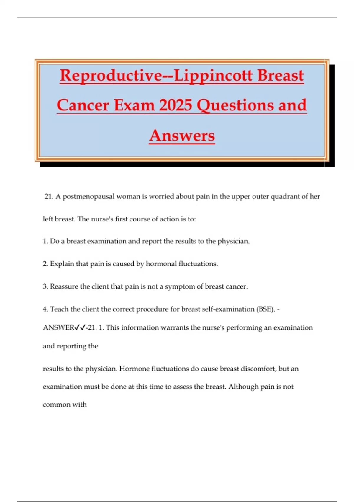 21. A postmenopausal woman is worried about pain in the upper outer quadrant of her