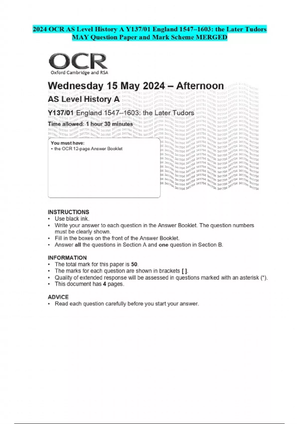 2024 OCR AS Level History A Y137/01 England 1547–1603: the Later Tudors MAY Question Paper and Mark Scheme MERGED