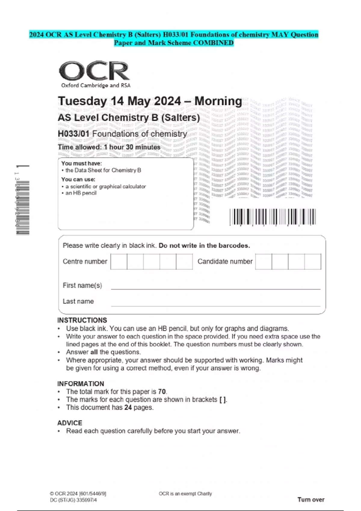024 OCR AS Level Chemistry B (Salters) H033/01 Foundations of chemistry MAY Question Paper and Mark Scheme COMBINED