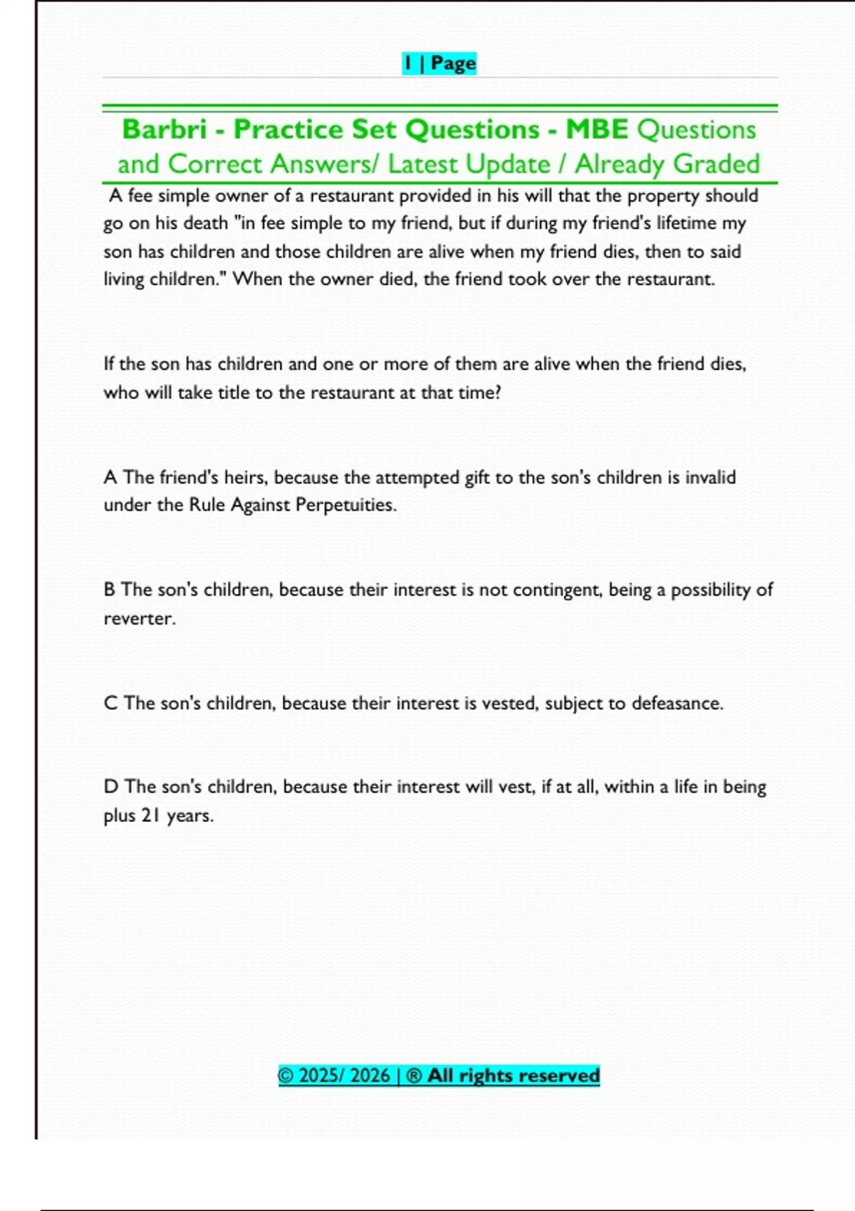 A fee simple owner of a restaurant provided in his will that the property should go on his death "in fee simple to my friend, but if during my friend's lifetime my son has children and those children are alive when my friend dies, then to said living children." When the owner died, the friend took over the restaurant. If the son has children and one or more of them are alive when the friend dies, who will take title to the restaurant at that time? A The friend's heirs, because the attempted gift to the son's children is invalid under the Rule Against Perpetuities. B The son's children, because their interest is not contingent, being a possibility of reverter. C The son's children, because their interest is vested, subject to defeasance. D The son's children, because their interest will vest, if at all, within a life in being plus 21 years. © 2025/ 2026 | ® All rights reserved 2 | Page Ans: D The son's children, because their interest will vest, if at all, within a life in being plus 21 years. The interest given to the son's children does not violate the Rule Against Perpetuities because the interest will vest, if at all, within 21 years after the life of the friend. Pursuant to the Rule Against Perpetuities, no interest in property is valid unless it must vest, if at all, not later than 21 years after one or more lives in being at the creation of the interest. In the case of a will, the perpetuities period begins to run on the date of the testator's death, and measuring lives used to show the validity of an interest must be in existence at that time. Here, the interest given to any of the son's children who are born during the friend's lifetime and who survive the friend must vest, if at all, on the death of the friend (who is a life in being at the time of the owner's death). Thus, this interest will vest, if it does vest, within 21 years after the friend's life, and is therefore not in violation of the Rule Against Perpetuities. (A) is therefore incorrect; if one or more of the son's children is alive at the time of the friend's death, the friend's heirs will get nothing because their fee simple will be divested. (B) incorrectly characterizes the interest of the son's children as a possibility of reverter. A possibility of reverter is the future interest left in a grantor who conveys a fee simple determinable estate. Although under different circumstances the son's children could acquire a possibility of reverter as heirs of the grantor (the owner), their interest in this case was conveyed directly to them in the owner's will. (C) is incorrect because the interest of the son's children is not vested. Their interest is a shifting executory interest rather than a remainder because it divests the fee sim A pedestrian walking on the sidewalk was struck by a car backing out of a driveway. The driver did not see the pedestrian because her neighbor's bushes obscured her view of the sidewalk. The pedestrian was seriously injured and brought suit against the driver and the neighbor. The pedestrian also included the city in his lawsuit, alleging that the city failed to enforce its ordinance requiring homeowners to provide a clear view of sidewalks where they intersect with driveways. The trier of fact determined that the driver was 60% at fault, the neighbor was 30% at fault, and the city was 10% at fault. The jurisdiction has adopted comparative contribution in cases applying joint and several liability. © 2025/ 2026 | ® All rights reserved 3 | Page Which of the following is a correct statement regarding liability? A The city is liable to the pedestrian for the full amount of the damage award. B Both the driver and the neighbor are liable to the pedestrian for 90% Ans: The city is liable to the pedestrian for the full amount of the damage award. A city council passed an ordinance providing: "No person may contribute more than $100 annually to any group organized for the specific purpose of supporting or opposing referenda to be voted on by the city electorate or regularly engaging in such activities." If the ordinance is challenged in federal court, how should the court rule on the constitutionality of this ordinance? A Strike it down, because it violates First Amendment rights of free speech and freedom of association. B Strike it down as a violation of due process, because no hearing mechanism has been provided for. C Uphold it, because the city council has a legitimate interest in controlling such contributions.