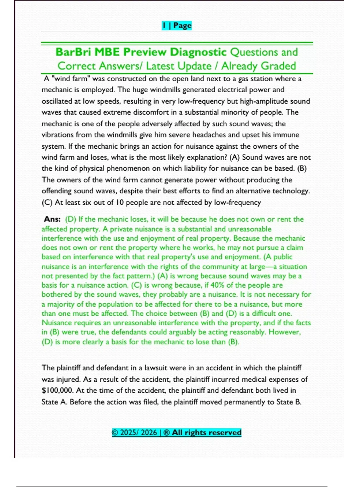BarBri MBE Preview Diagnostic Questions and Correct Answers/ Latest Update / Already Graded