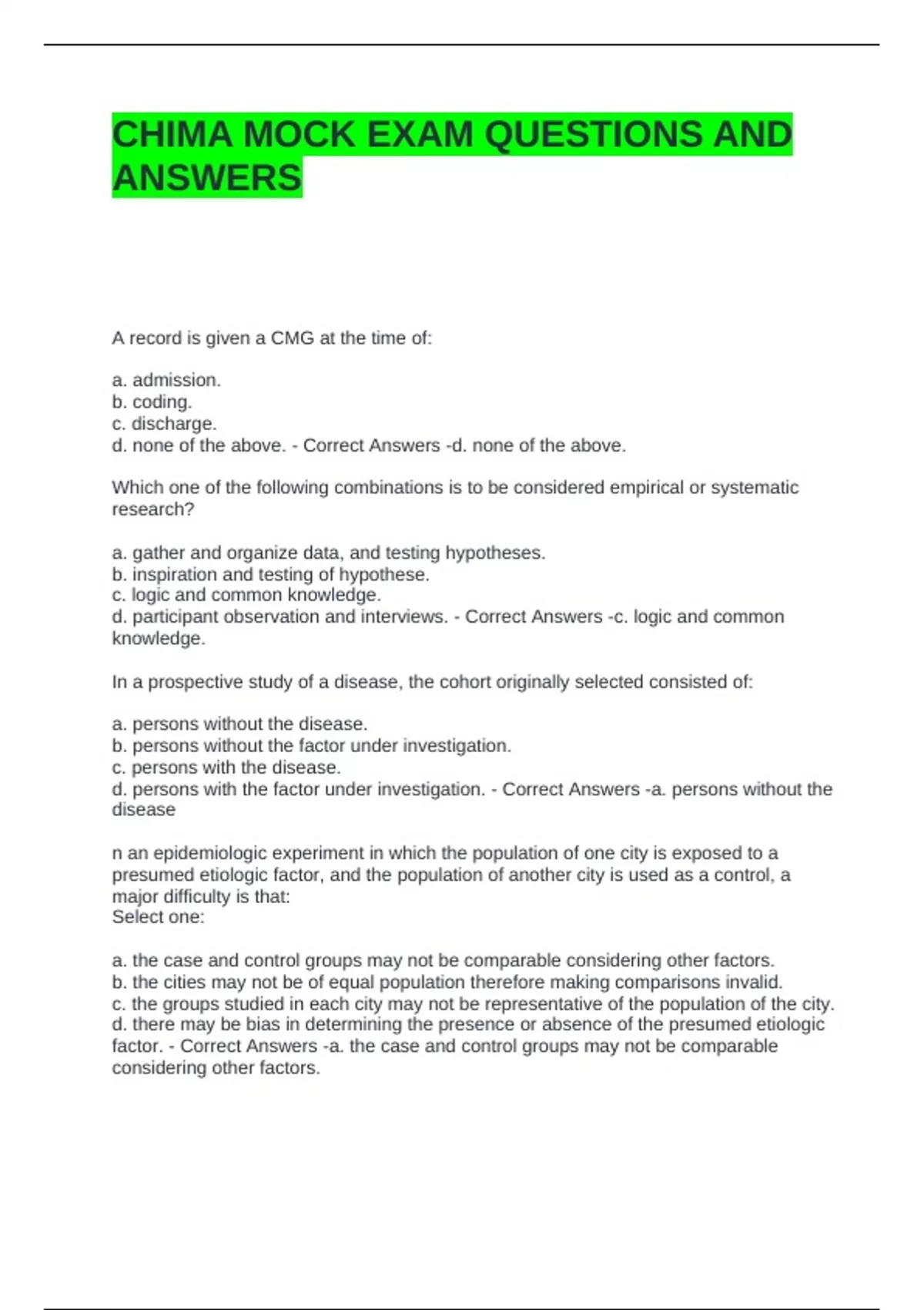 CHIMA MOCK EXAM QUESTIONS AND ANSWERS (GRADED A)