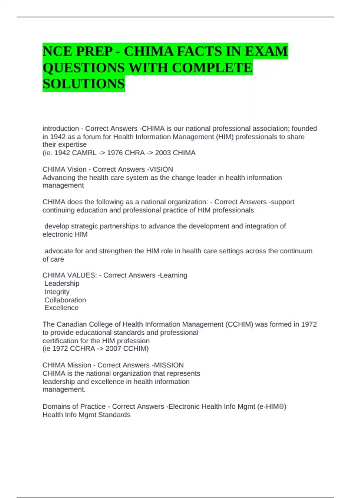 NCE PREP - CHIMA FACTS IN EXAM QUESTIONS WITH COMPLETE SOLUTIONS
