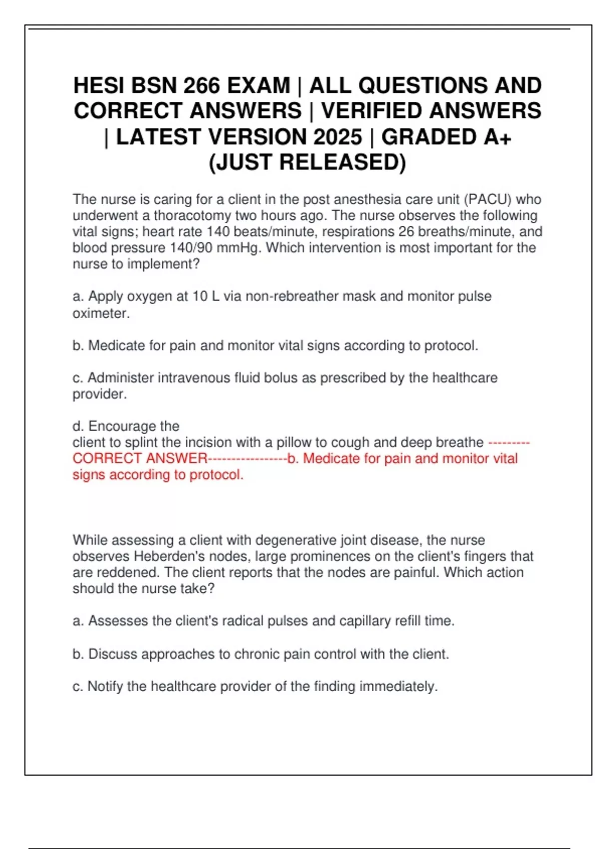 CORRECT ANSWER-----------------b. Medicate for pain and monitor vital