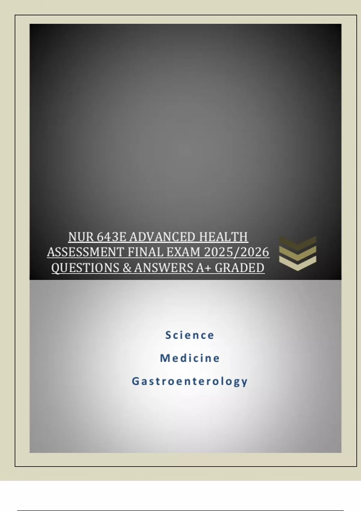 NUR 643E ADVANCED HEALTH ASSESSMENT FINAL EXAM 2025/2026 QUESTIONS & ANSWERS A+ GRADED What are the parts of the large intestine? - CORRECT ANS-Cecum Asending colon Transverse colon Descending colon (sigmoid, rectum, anal) In what part of the digestive system are fats and proteins broken down? - CORRECT ANS-The stomach - uses HCL and enzymes What lines the surface of the small intestine to help absorb nutrients? - CORRECT ANS-Villi What are the parts of the small intestine? - CORRECT ANS-duodenum, jejunum, ileum What are the parts of the stomach? - CORRECT ANS-The fundus, antrum and the body What is peristalsis? - CORRECT ANS-The sequential autonomic muscular contractions that move nutrients along the digestive tract What part of the digestive system is responsible absorbing water, lubricating contents, and putrefaction? - CORRECT ANS-Large intestine What is putrefaction? - CORRECT ANS....