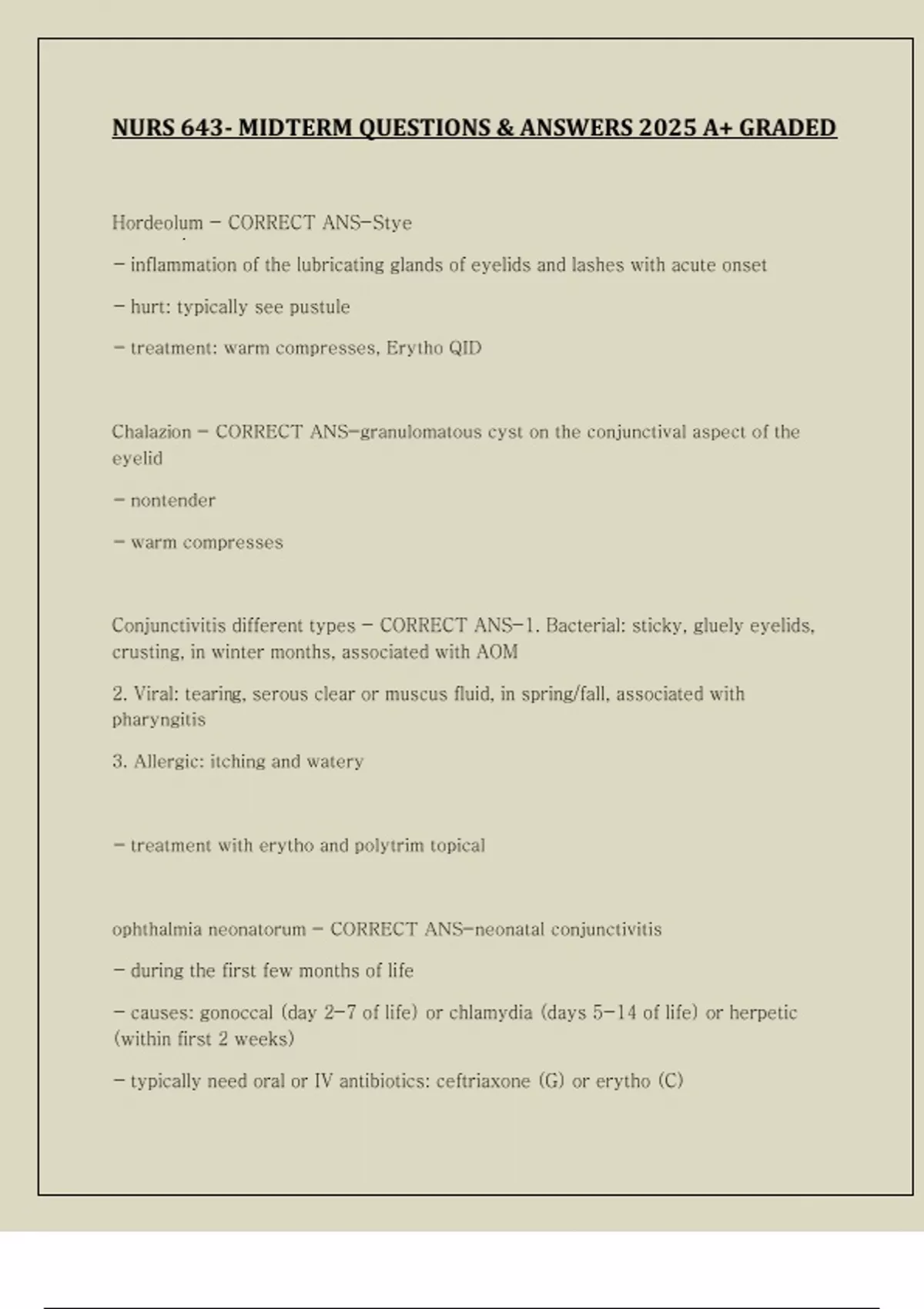 NURS 643- MIDTERM QUESTIONS & ANSWERS 2025 A+ GRADED Hordeolum - CORRECT ANS-Stye - inflammation of the lubricating glands of eyelids and lashes with acute onset - hurt: typically see pustule - treatment: warm compresses, Erytho QID Chalazion - CORRECT ANS-granulomatous cyst on the conjunctival aspect of the eyelid - nontender - warm compresses Conjunctivitis different types - CORRECT ANS-1. Bacterial: sticky, gluely eyelids, crusting, in winter months, associated with AOM 2. Viral: tearing, serous clear or muscus fluid, in spring/fall, associated with pharyngitis 3. Allergic: itching and watery - treatment with erytho and polytrim topical ophthalmia neonatorum - CORRECT ANS-neonatal conjunctivitis - during the first few months of life - causes: gonoccal (day 2-7 of life) or chlamydia (days 5-14 of life) or herpetic (within first 2 weeks) - typically need oral or IV antibiotics: ceftriaxone (G) or erytho (C) Daryostenosis - CORRECT ANS-blocked tear ducts - due to membrane at birth that covers the nasolacrimal duct which fails to break down quickly - treat by massaging out obstruction, if gets infected need antibiotics Eye trauma - CORRECT ANS-types: hemorrhage, abrasion, hyphemas, orbital fractures - can use fluorescein eye stain to detect foreign bodies - treatment: flush with water for 20 mins, vision eval, antibiotic or steroid drops Periorbital cellulitis - CORRECT ANS...
