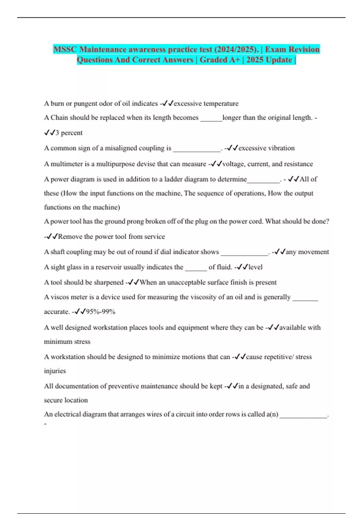MSSC Maintenance awareness practice test (2024/2025). | Exam Revision Questions And Correct Answers | Graded A+ | 2025 Update |