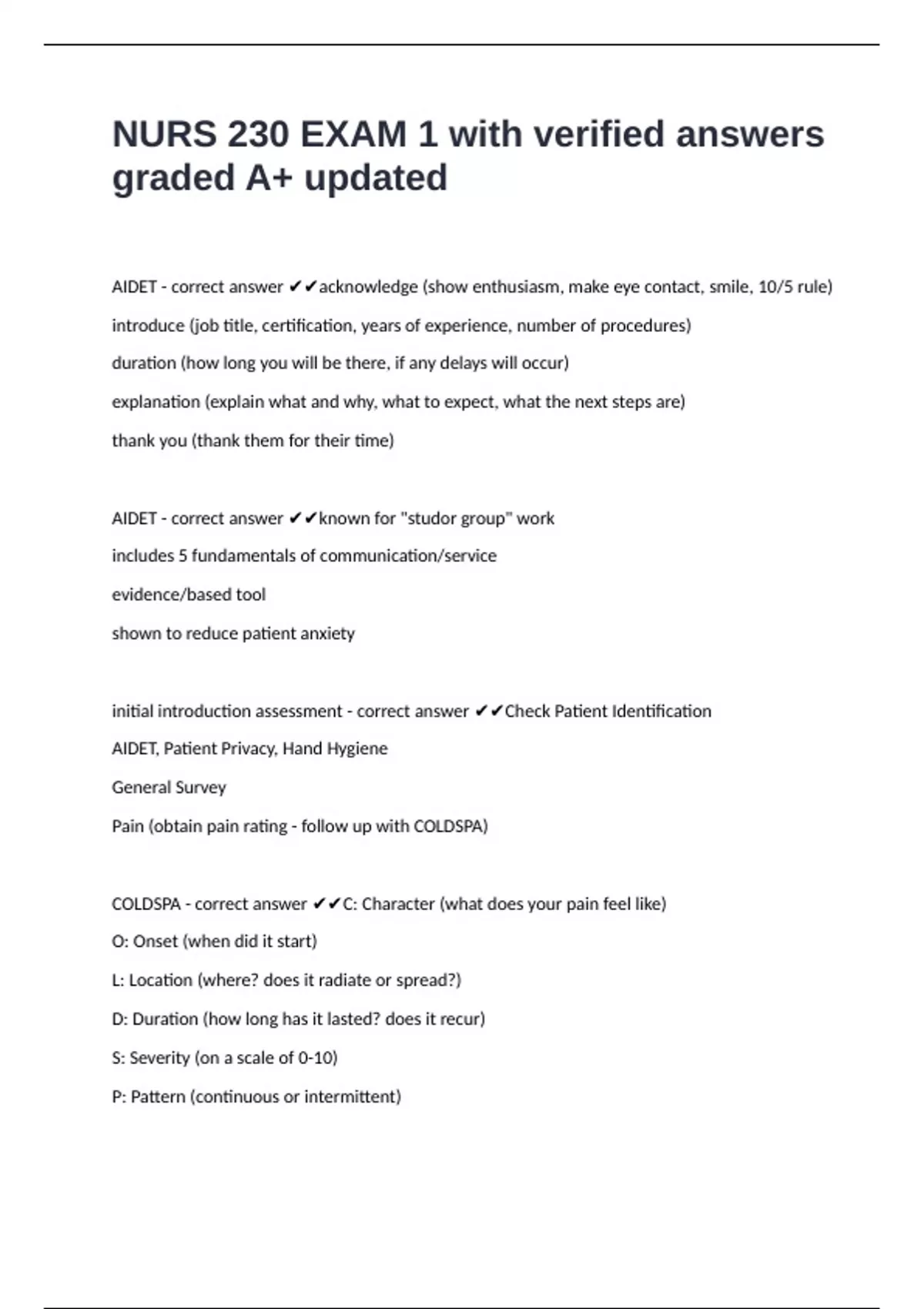 NURS 230 EXAM 1 with verified answers graded A+ updated