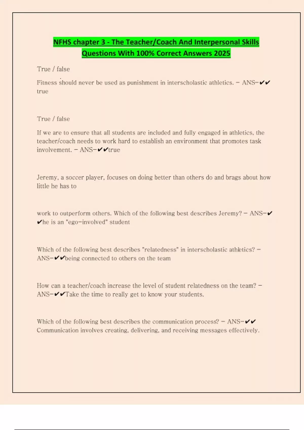 NFHS chapter 3 - The Teacher/Coach And Interpersonal Skills Questions With 100% Correct Answers 2025 True / false Fitness should never be used as punishment in interscholastic athletics. - ANS-true True / false If we are to ensure that all students are included and fully engaged in athletics, the teacher/coach needs to work hard to establish an environment that promotes task involvement. - ANS-true Jeremy, a soccer player, focuses on doing better than others do and brags about how little he has to work to outperform others. Which of the following best describes Jeremy? - ANS-he is an "ego-involved" student Which of the following best describes "relatedness" in interscholastic athletics? - ANS-being connected to others on the team How can a teacher/coach increase the level of student relatedness on the team? - ANS-
