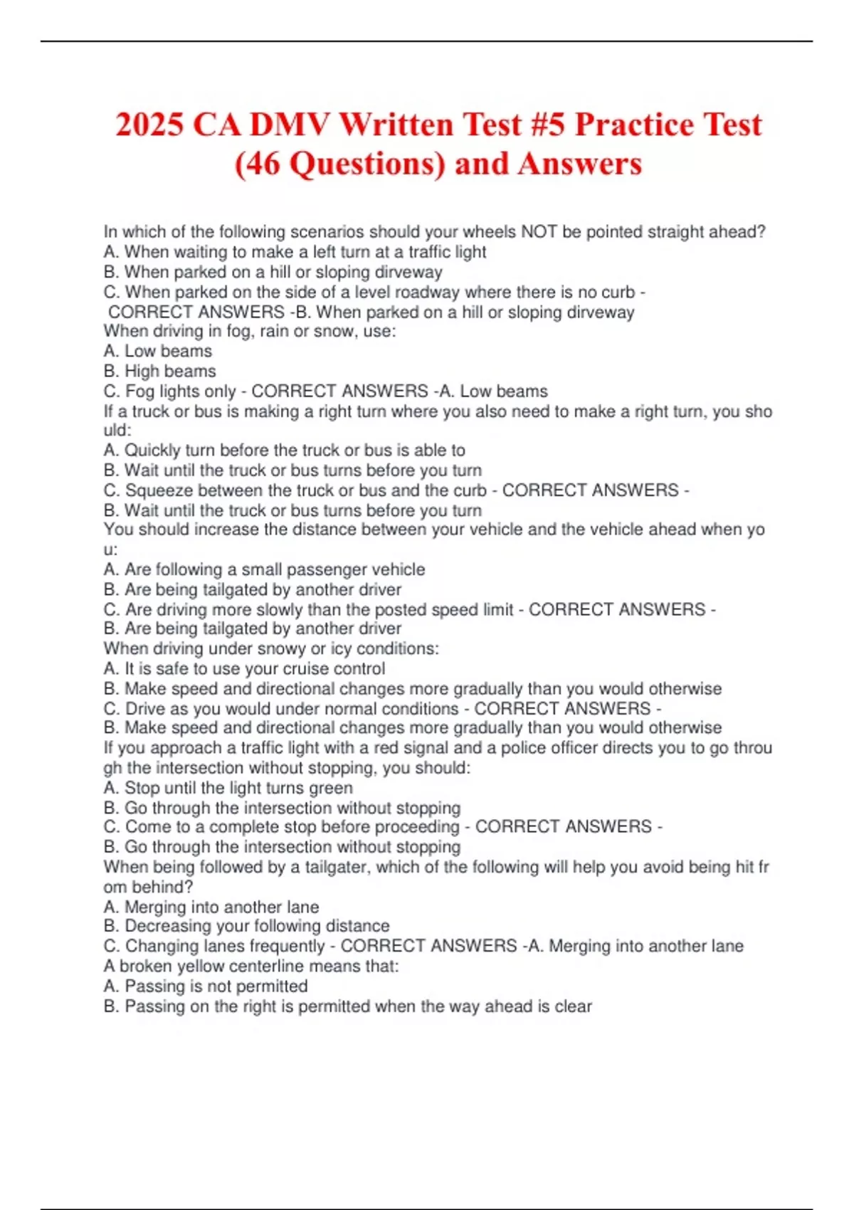 2025 CA DMV Written Test -5 Practice Test (46 Questions) and Answers