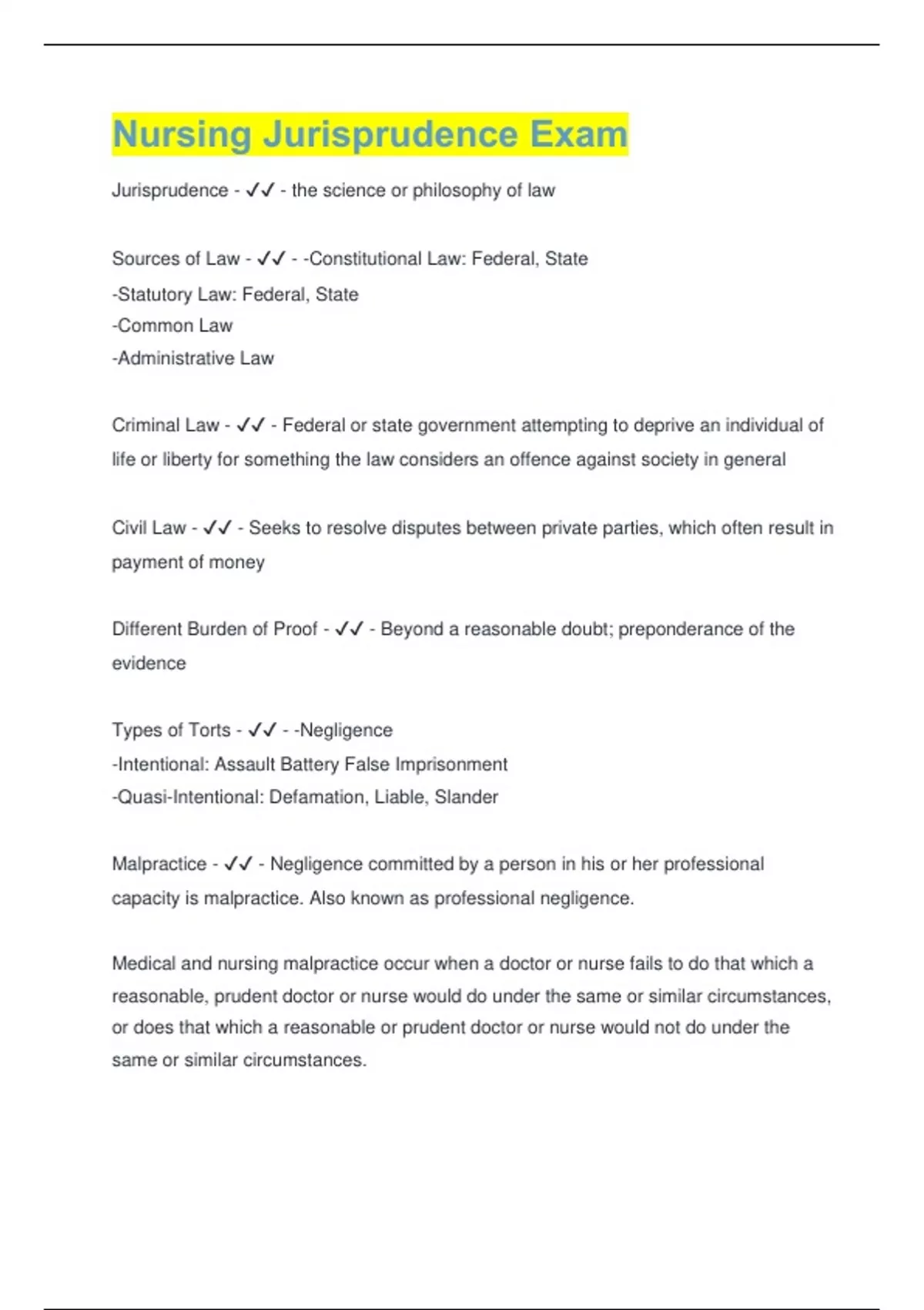 ,Elements of a Nursing Malpractice Lawsuit - ✔✔ - Duty - the existence of a duty, owed