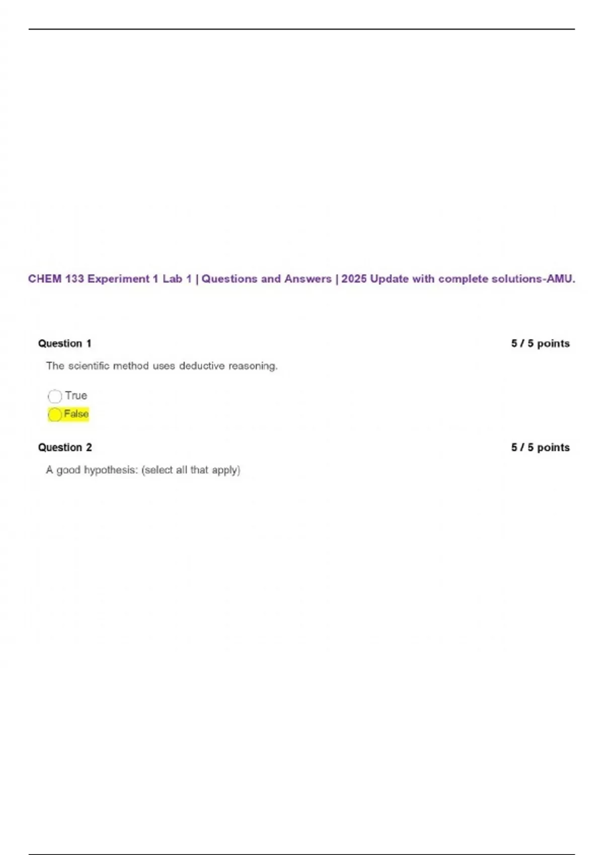 CHEM 133 Experiment 1 Lab 1 | Questions and Answers | 2025 Update with complete solutions-AMU.