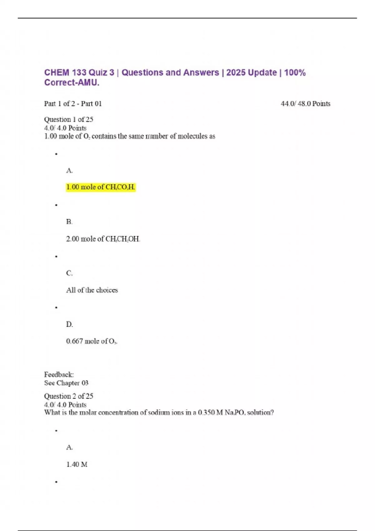 CHEM 133 Quiz 3 | Questions and Answers | 2025 Update | 100% Correct-AMU.